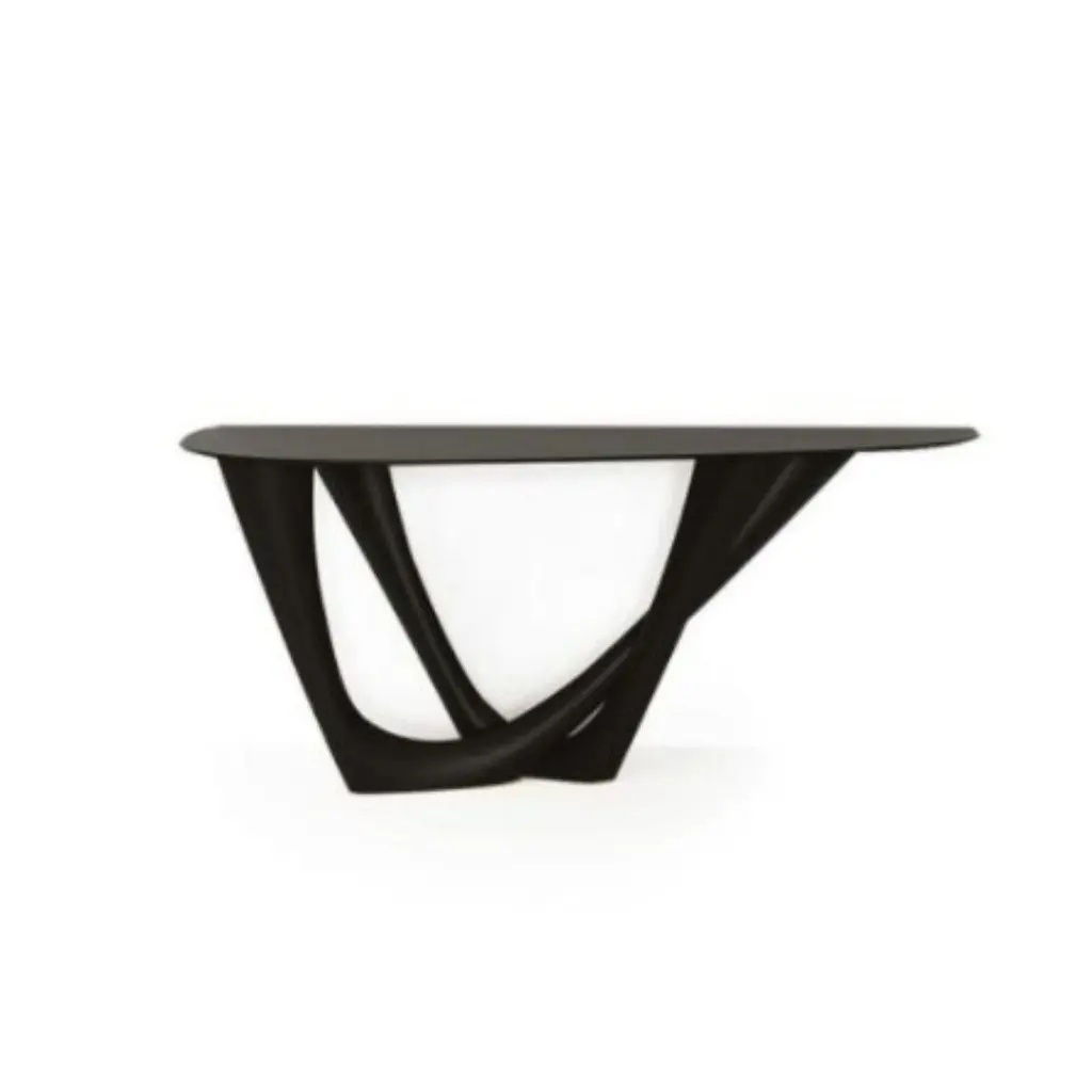 Black brown g-console duo steel base and top by Zieta.Dimensions: D 43 x W 159 x H 75 cm.Material: Steel.Also available in different colors and dimensions.G-Console is another bionic object in our collection. Created for smaller spaces, it gives another possibility in interior planning and at the same time preserves the unique shape of the original G-Table. Both objects were made for enthusiasts of bionic forms. Made with FiDU technology, it reminds of vines or tree roots. Nature symbolizes a constant changeability and harmony that comes out of it. A diverse structure refers to both natural forms and processes. G-Console comes in two versions – Mono and Duo.About Zieta: Zietas main goal is to deliver uniqueness and customization in design and construction while keeping the production, transport, and warehousing innovatively efficient.This is how they imagine the future world: Light, durable structures of customized applications produced on demand out of one-of-a-kind parts, yet efficiently.They use a computer-controlled production process. Customized pattern, customized form, customized function, one-of-a-kind product, and outstanding precision are what they deliver.You will find all of this philosophy reflected in the products. They research, they discover new possibilities, they play with forms and they deliver a beautiful, innovative, surprising outcome to people who love the design and who care about design development.They believe their work is a valuable contribution to the world of design not only by the unique beauty of the forms but most of all by opening ultra-innovative opportunities of forming and new paths for the world of the future.