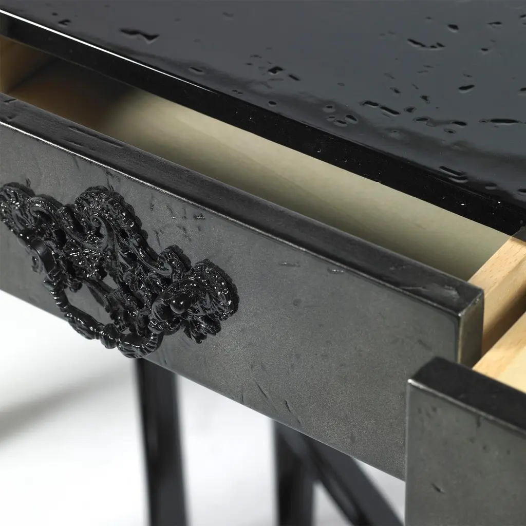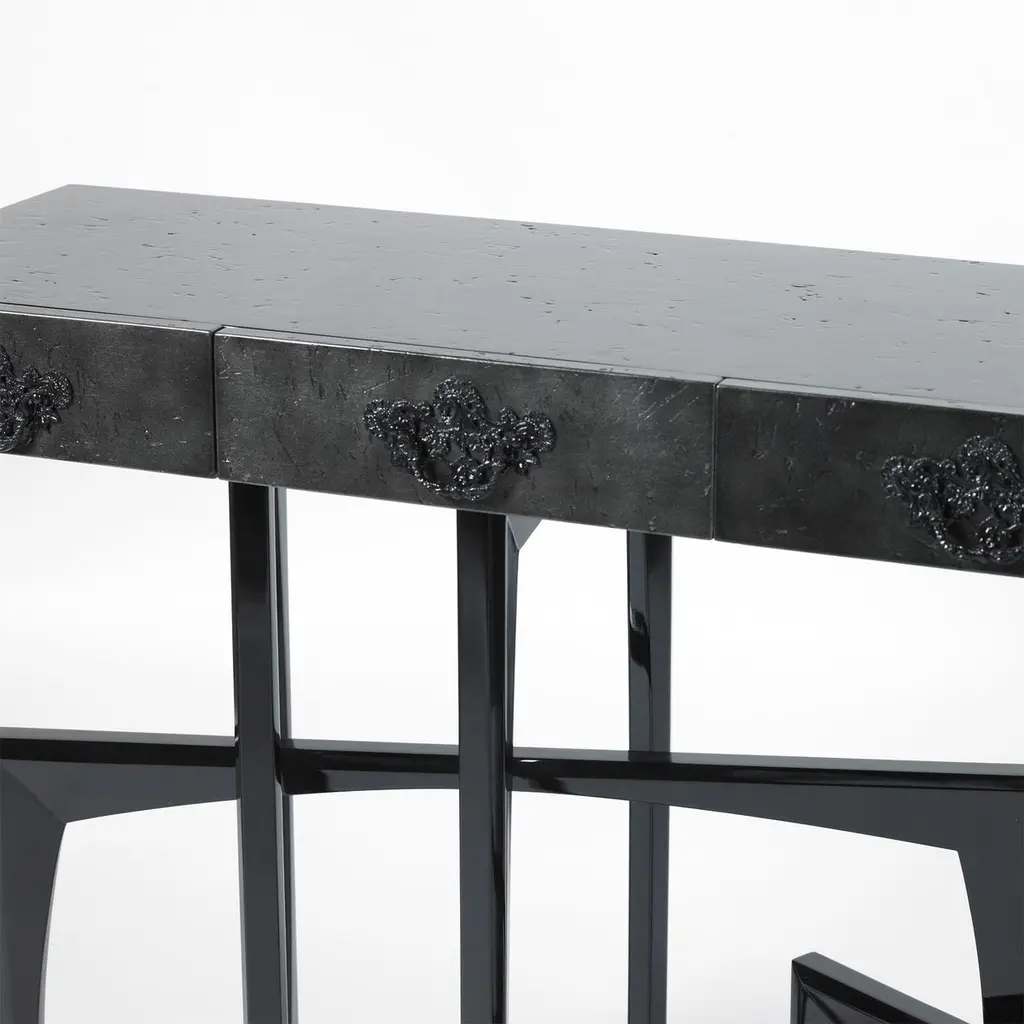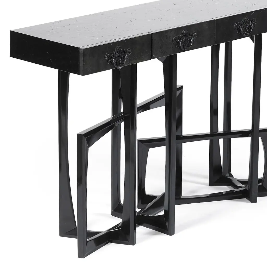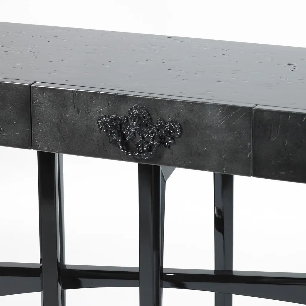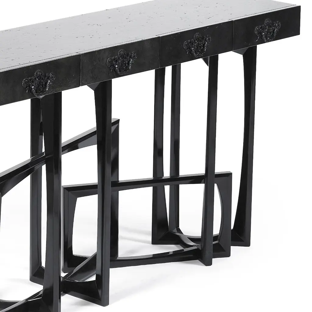 Console table black frame with solid mahogany structurehand painted with black lacquered paint. Base in blacklacquered paint. Exceptional piece.Available in gold leaf finish.