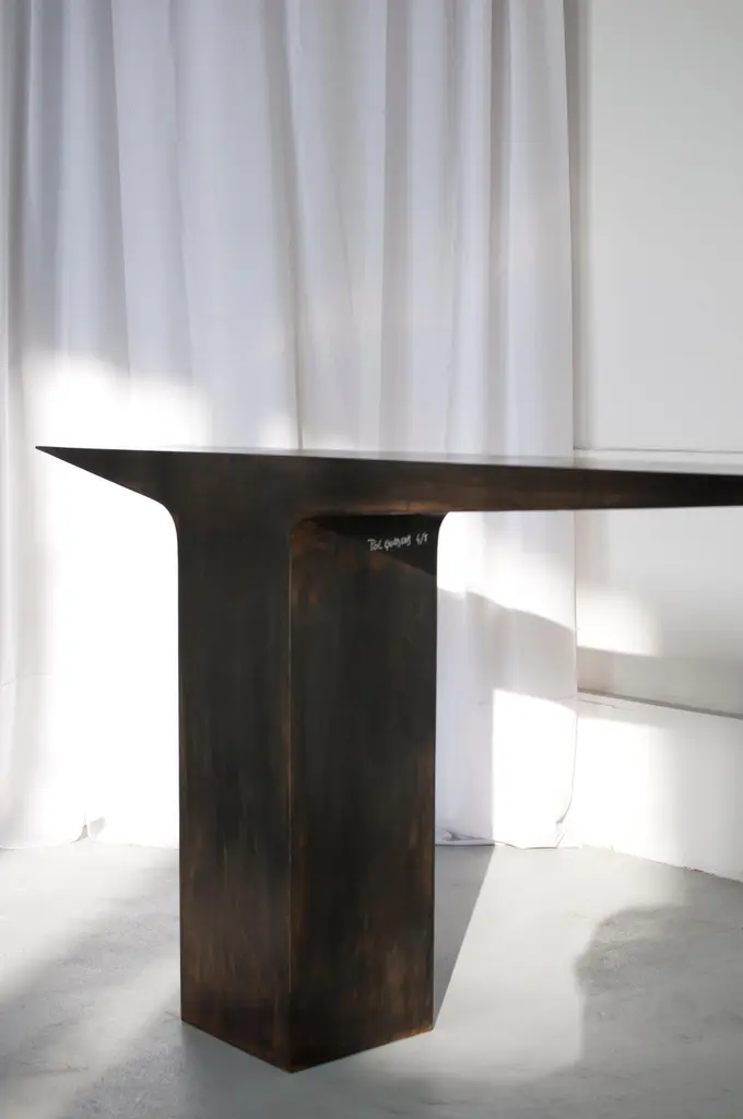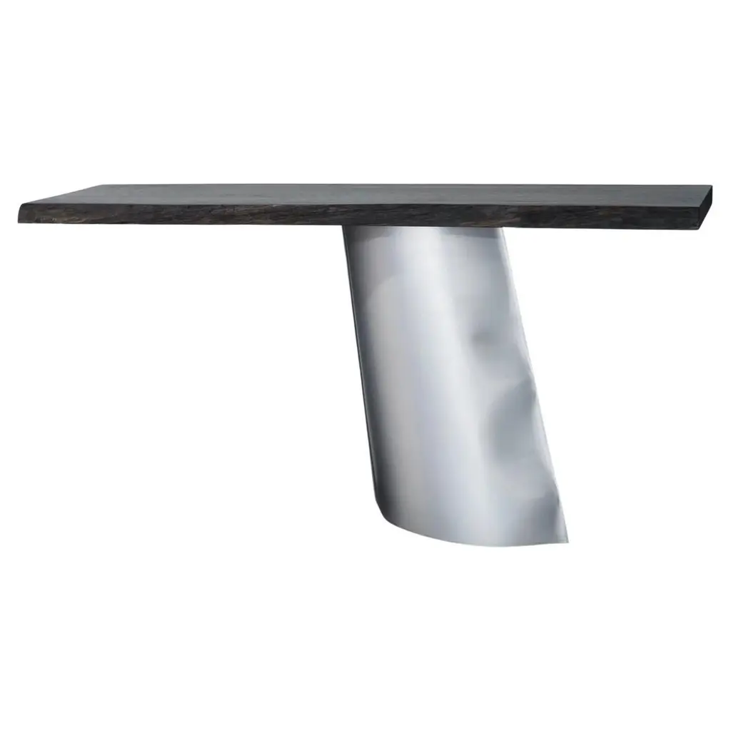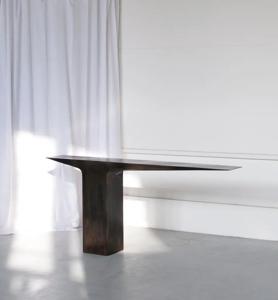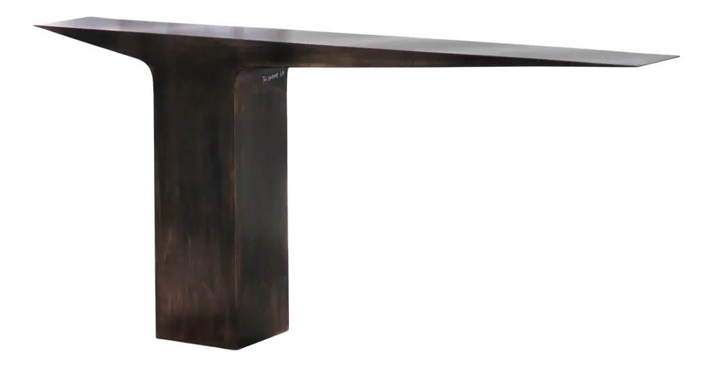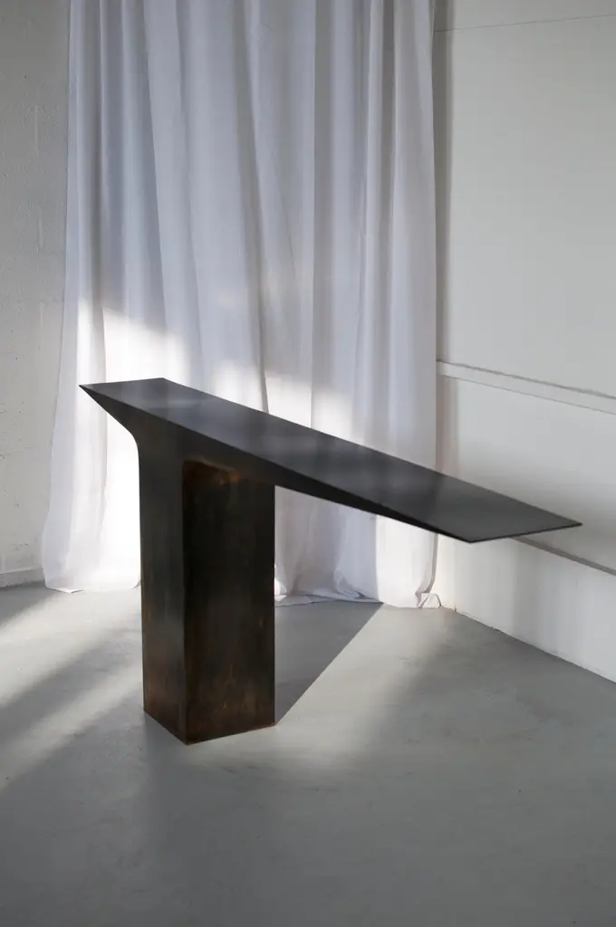 Black Patina Blade Console by Pol Quadens Limited Edition Of 8+4 Pieces.Dimensions: D 30 x W 210 x H 95 cm.Materials: Patinated steel.Pol Quadens was born in Brussels. His father was active in the fields of composites the metal industry, and the world of materials, therefore, surrounded Pol since his early childhood. After his artistic studies, he starts restoring vintage cars. This experience has allowed him to gain strong practical skills and a deep knowledge of all materials.In 1987, he made his first creations and production of objects. His sensitivity and passion for the arts led him to create functional artworks. His CD shelf has sold more than 100,000 pieces and has become iconic in its category.