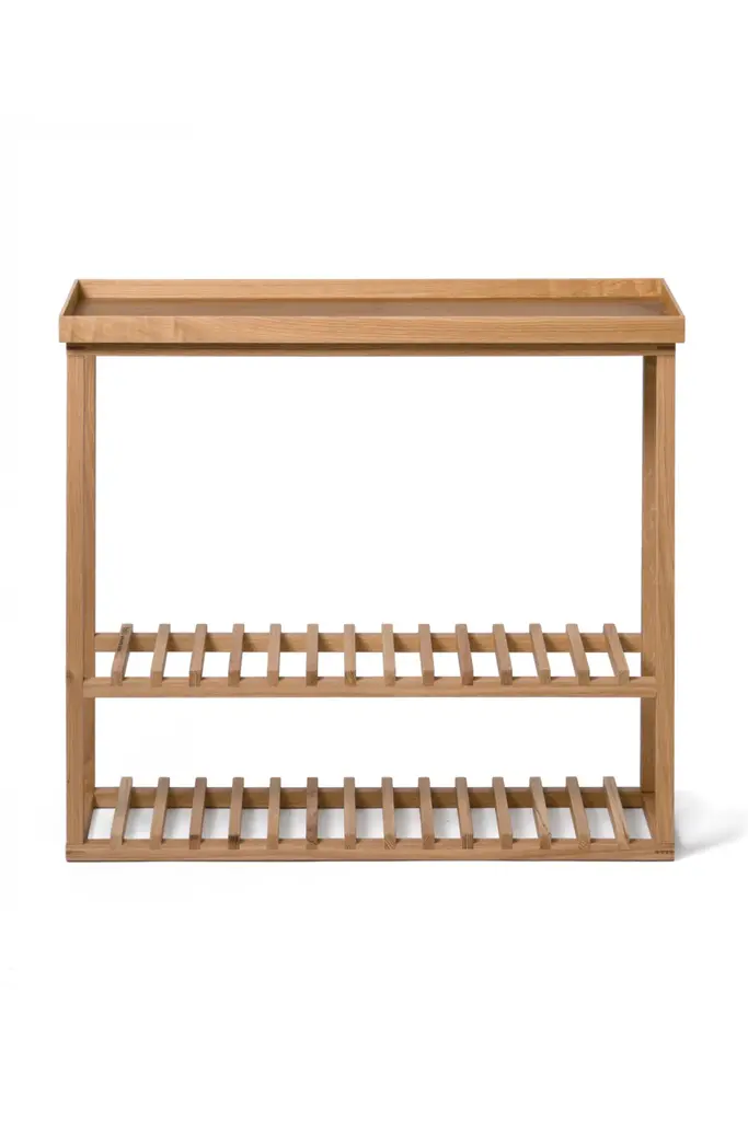 Hello storage table will push flush against a wall, the slim profile will not block a hallway. It has two slatted shelves for footwear and will store both shoes and tall boots. The top surface has a lipped edge to stop things falling off and is perfect for keys, mail, gloves or sunglasses. The top is epoxy painted. The legs are made from sustainably harvested natural American white oak and oak veneers, selected for their warm color, beautiful grain pattern and traditional hardwood quality. All edges look crisp but are carefully hand sanded to make them soft to the touch. Finished with a matt, water resistant lacquer. Design by Lincoln Rivers.