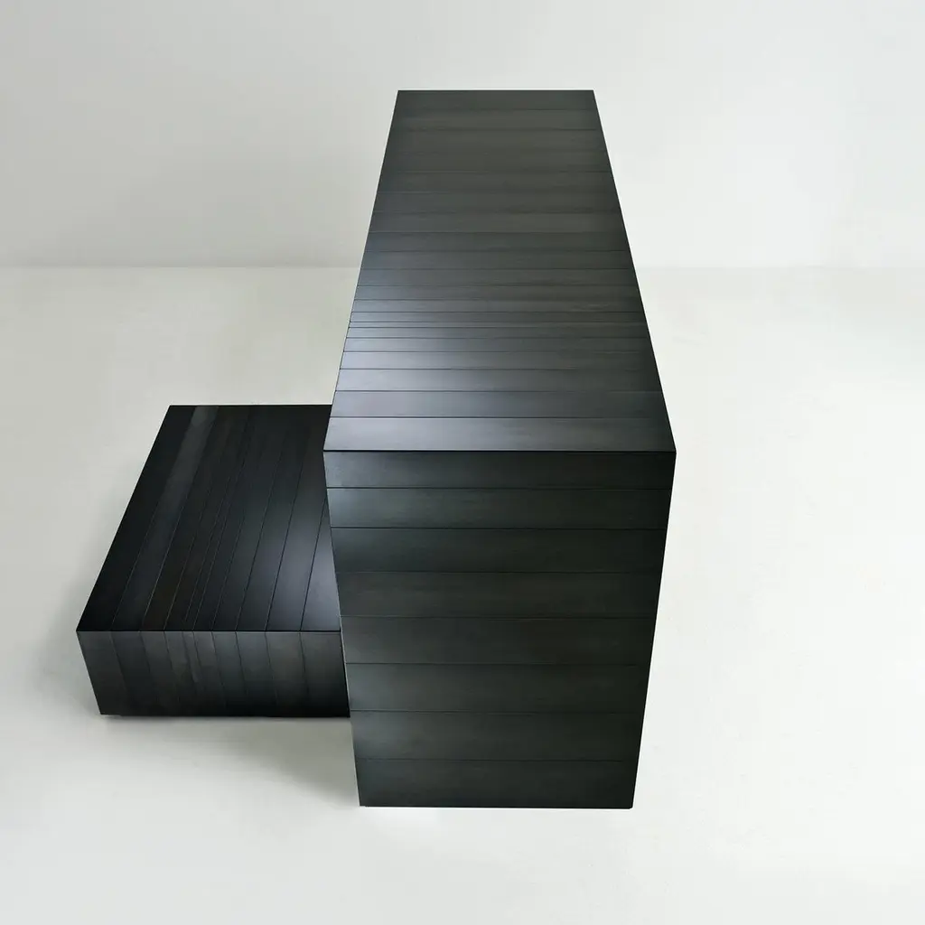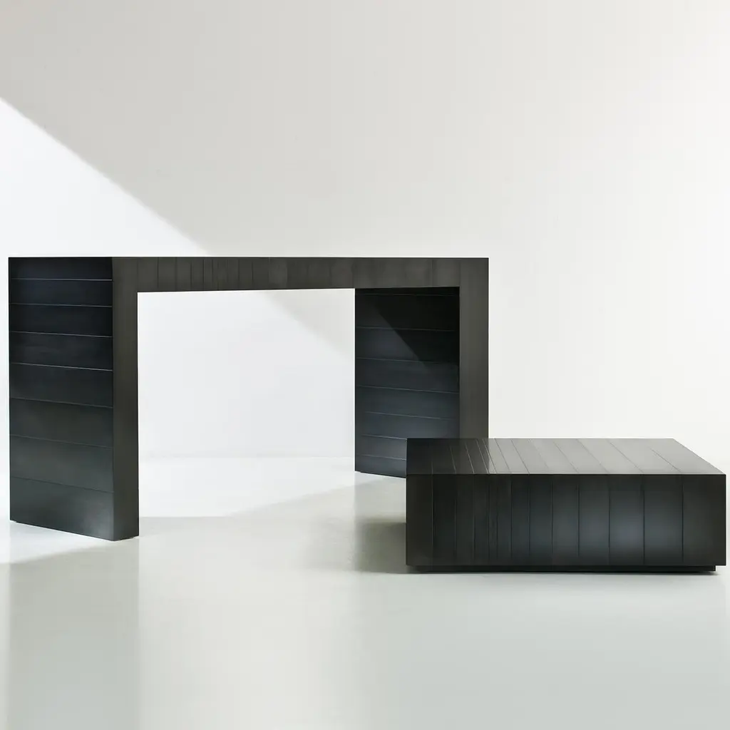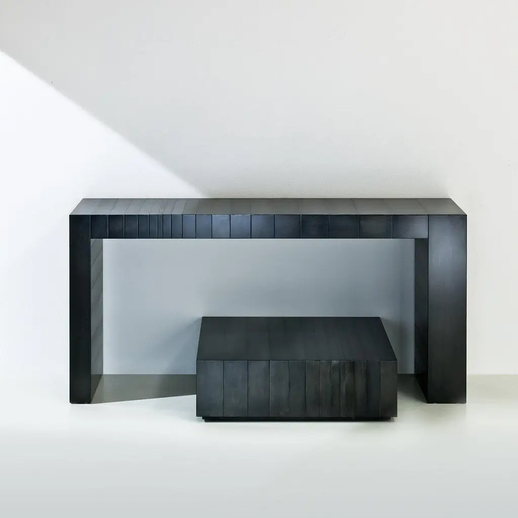 Simple lines run vertically through the top and supporting sides of this solid, modern console table, giving it movement and a modern look. Both the sides and the top of this piece are entirely finished in black metal, and various finishes are available. This piece will add a bit of design to any home or office space.
