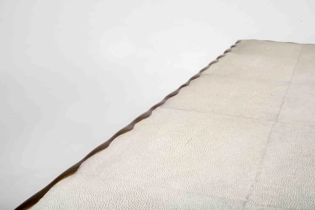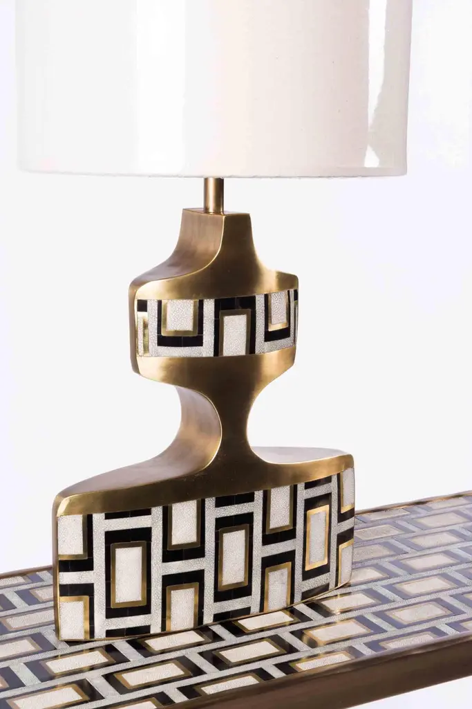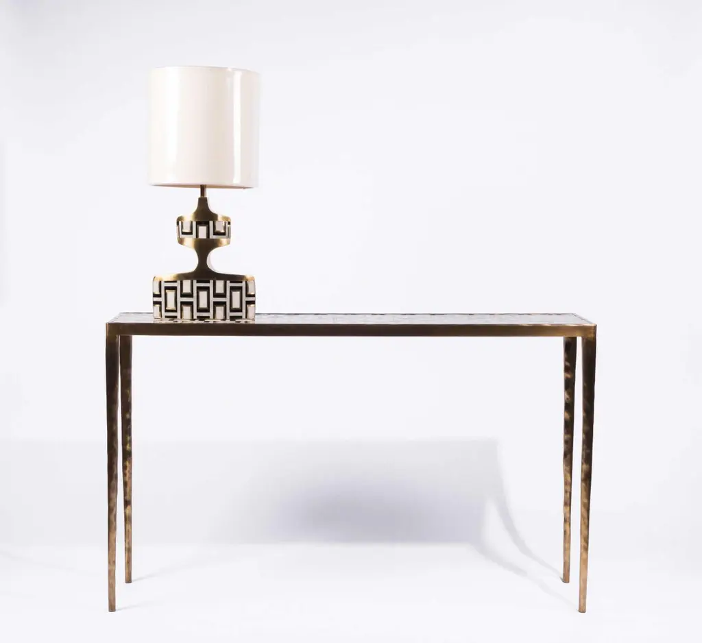 The Paris based label has distinguished themselves since their launch, with their iconic use of shagreen mixed with brass and other exotic materials. All furniture is handcrafted by skilled artisans, ultimately making each piece unique, designed in Paris and produced in the Philippines.The block pattern console inlaid in a mixture of cream shagreen, coal black pen shell and bronze patina brass demonstrates the incredible hand-craftsmanship of Augousti. The geometric pattern against the simple but elegant shape of the console, makes for an adaptable neutral piece of furniture with a slight pop. The pattern-inlaid top is framed with an irregular surface bronze-patina brass that creates a "melting" effect against the flat surface of the top, as the bronze-patina brass detail continues on the legs. The matching lamp is also available to purchase separately. A plain version of the console table is also available, images at end of slide.The dimensions of this piece are 150 x 35 x 90 cm / 59" x 14" x 35"All R&Y Augousti pieces are handmade by artisans, ultimately making each piece unique. Wipe clean with soft dry cloth.Acclaimed design duo Ria & Yiouri Augousti have established themselves since the 1990s as pioneers of modern-vintage style through their luxurious Art Deco inspired collections.The Paris based label has distinguished themselves since their launch, with their iconic use of shagreen mixed with brass and other exotic materials. All furniture is handcrafted by skilled artisans, ultimately making each piece unique. All shagreen-covered items should be kept out of direct sunlight, color variants may occur on the stingray and other exotic finishes, but this showcases the Parisian label's commitment to creating authentic luxurious products using natural components.