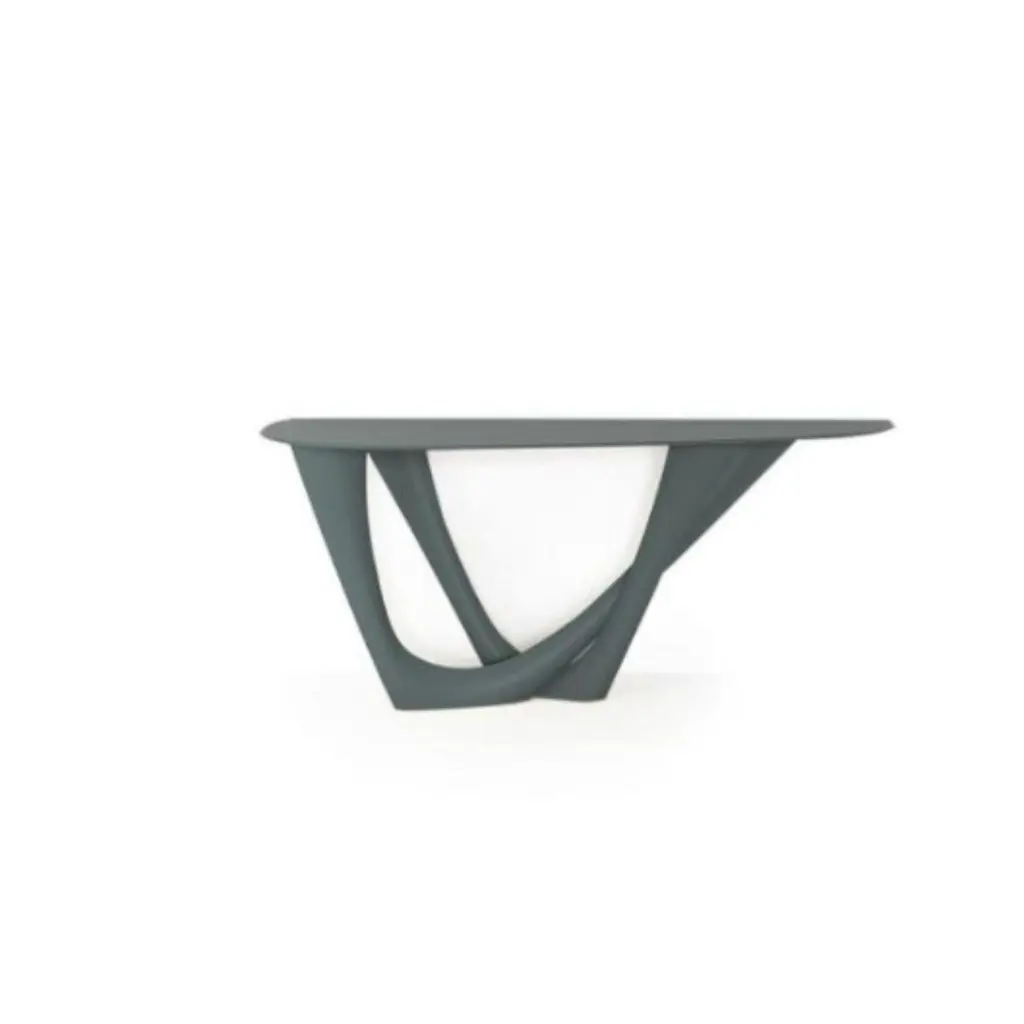 Blue grey G-console duo steel base and top by ZietaDimensions: D 56 x W 168 x H 75 cm Material: steelAlso available in different colors and dimensions.G-Console is another bionic object in our collection. Created for smaller spaces, it gives another possibility in interior planning and at the same time preserves the unique shape of the original G-Table. Both objects were made for enthusiasts of bionic forms. Made with FiDU technology, it reminds of vines or tree roots. Nature symbolizes a constant changeability and harmony that comes out of it. A diverse structure refers to both natural forms and processes. G-Console comes in two versions – Mono and Duo.About Zieta: Zietas main goal is to deliver uniqueness and customization in design and construction while keeping the production, transport, and warehousing innovatively efficient.This is how they imagine the future world: Light, durable structures of customized applications produced on demand out of one-of-a-kind parts, yet efficiently.They use a computer-controlled production process. Customized pattern, customized form, customized function, one-of-a-kind product, and outstanding precision are what they deliver.You will find all of this philosophy reflected in the products. They research, they discover new possibilities, they play with forms and they deliver a beautiful, innovative, surprising outcome to people who love the design and who care about design development.They believe their work is a valuable contribution to the world of design not only by the unique beauty of the forms but most of all by opening ultra-innovative opportunities of forming and new paths for the world of the future.