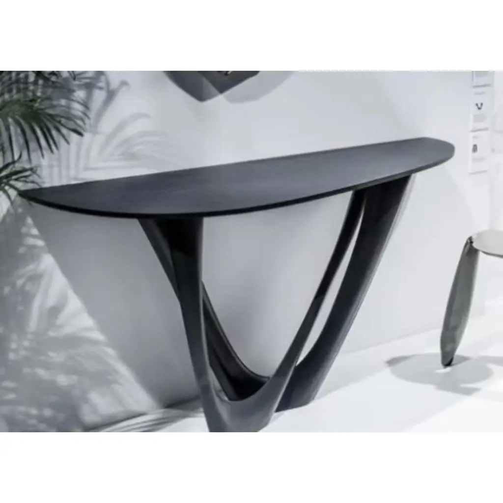 Blue grey G-Console steel base with steel top Mono by ZietaDimensions: D 43 x W 159 x H 75 cm Material: Carbon steel.Also available in different colors and dimensions.G-Console is another bionic object in our collection. Created for smaller spaces, it gives another possibility in interior planning and at the same time preserves the unique shape of the original G-Table. Both objects were made for enthusiasts of bionic forms. Made with FiDU technology, it reminds of vines or tree roots. Nature symbolizes a constant changeability and harmony that comes out of it. A diverse structure refers to both natural forms and processes. G-Console comes in two versions – Mono and Duo.About Zieta: Zietas main goal is to deliver uniqueness and customization in design and construction while keeping the production, transport, and warehousing innovatively efficient.This is how they imagine the future world: Light, durable structures of customized applications produced on demand out of one-of-a-kind parts, yet efficiently.They use a computer-controlled production process. Customized pattern, customized form, customized function, one-of-a-kind product, and outstanding precision are what they deliver.You will find all of this philosophy reflected in the products. They research, they discover new possibilities, they play with forms and they deliver a beautiful, innovative, surprising outcome to people who love the design and who care about design development.They believe their work is a valuable contribution to the world of design not only by the unique beauty of the forms but most of all by opening ultra-innovative opportunities of forming and new paths for the world of the future.