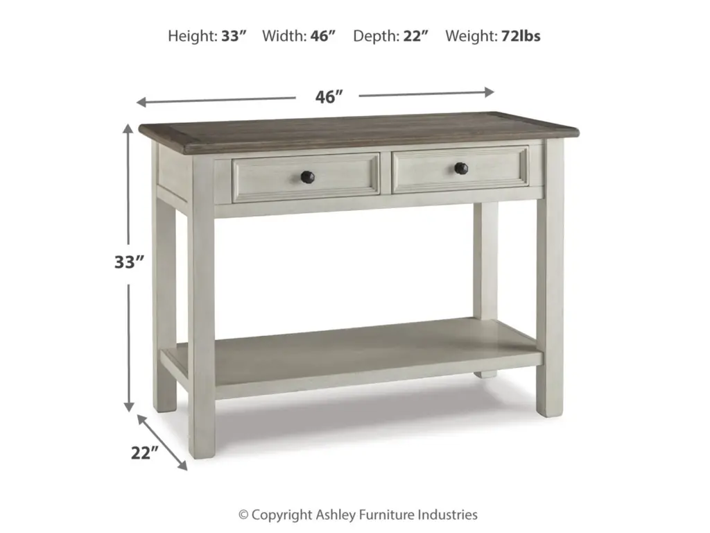 Store and showcase your favorite things with the Bolanburg sofa table. Its textured antique white finish creates a vintage two-tone look that will endure for years.
