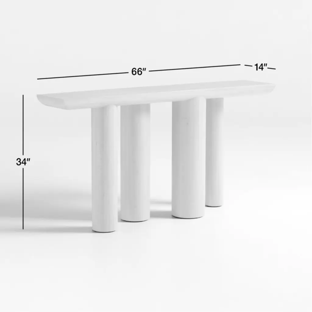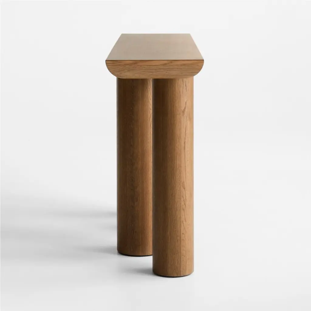 Like a piece of modern sculpture, our Bomen console table makes a bold statement of balanced form and proportion. Mathematical relationships are key to its striking design, featuring round legs that each increase incrementally in diameter. Meant to be experienced at varying angles, the table legs are staggered when viewed straight on but are perfectly parallel when seen from the side. The asymmetrical table is made of solid oak and oak veneer with a warm brown barley finish to enliven the grain. A scene-stealer in a living room or entryway, the Bomen oak console table is a Crate & Barrel exclusive.