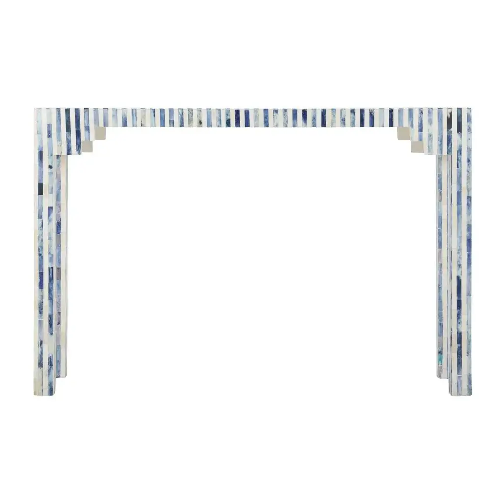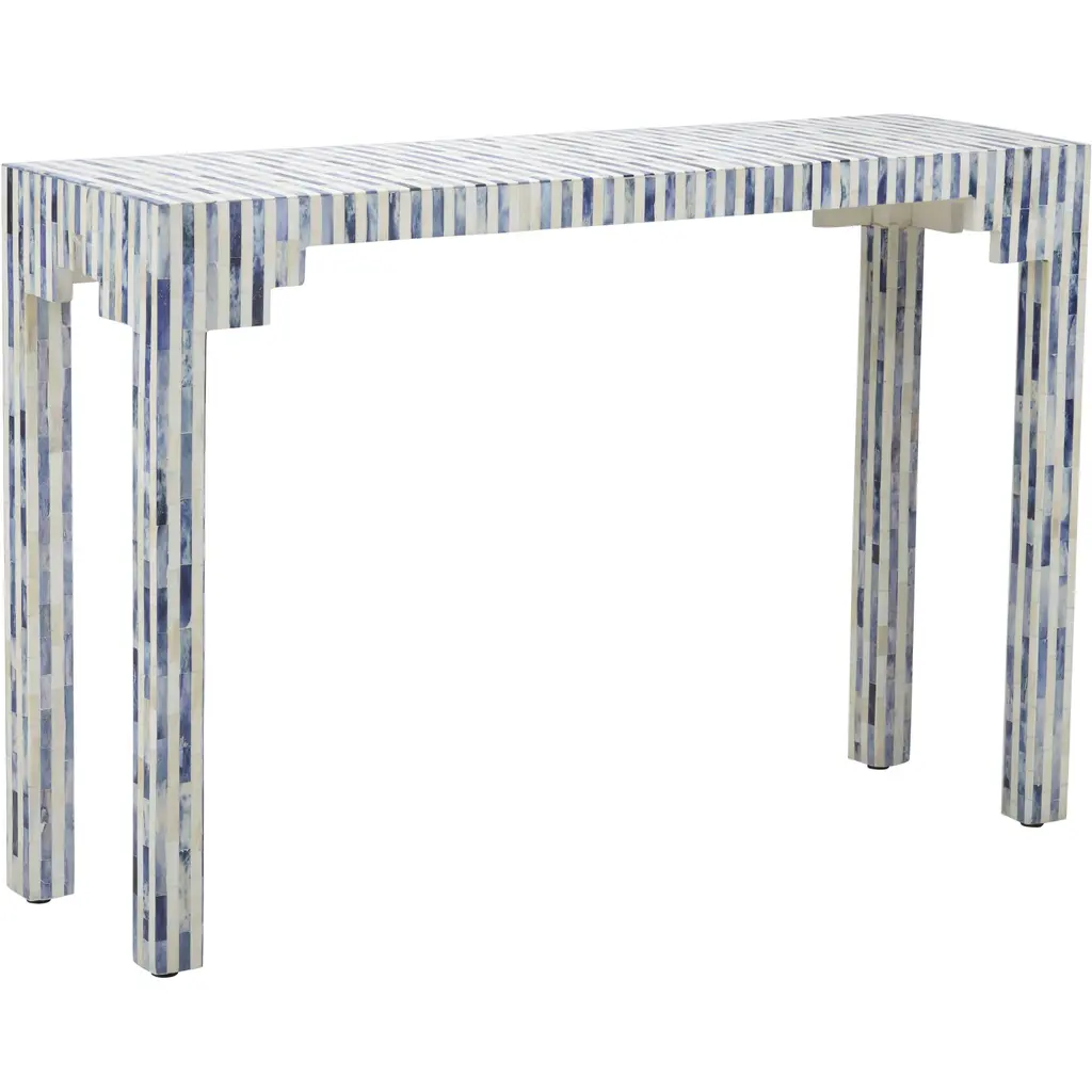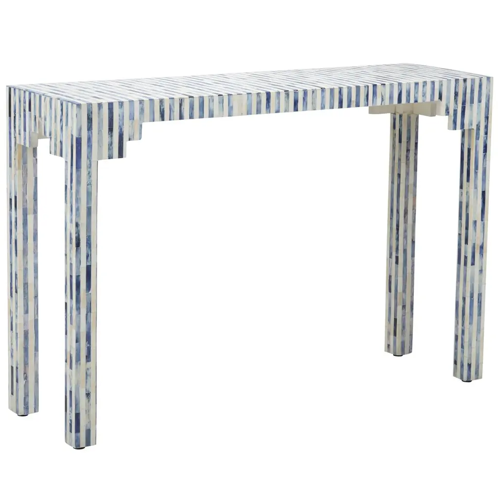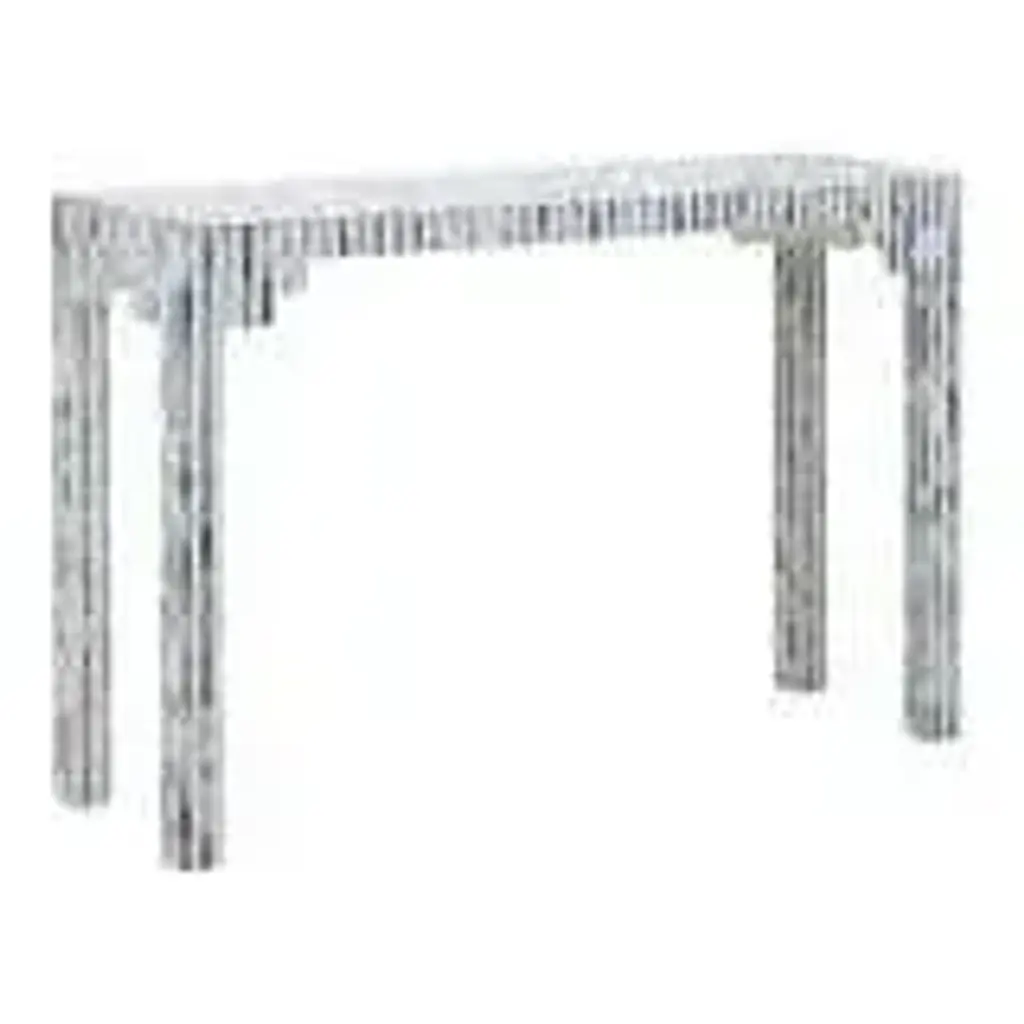 This thin versatile console table features exquisite craftsmanship with hand cut bone inlay.