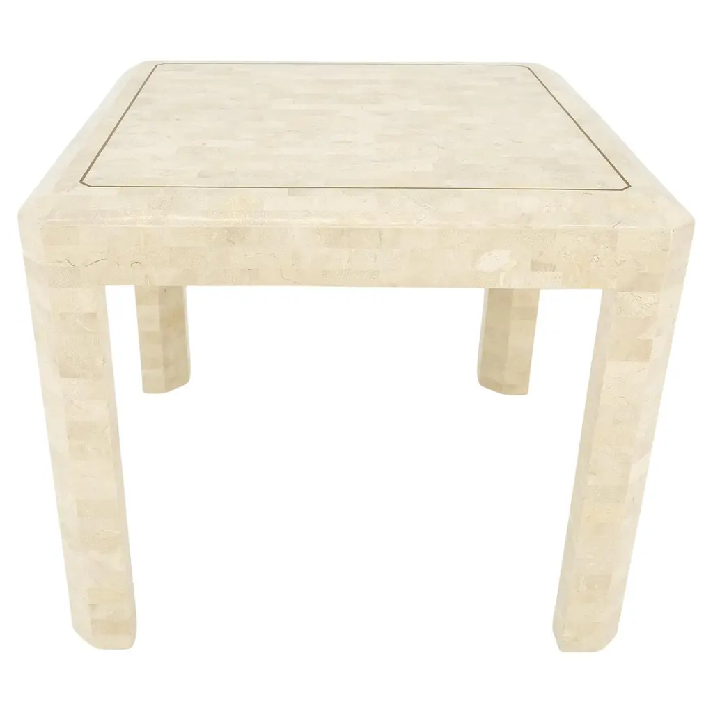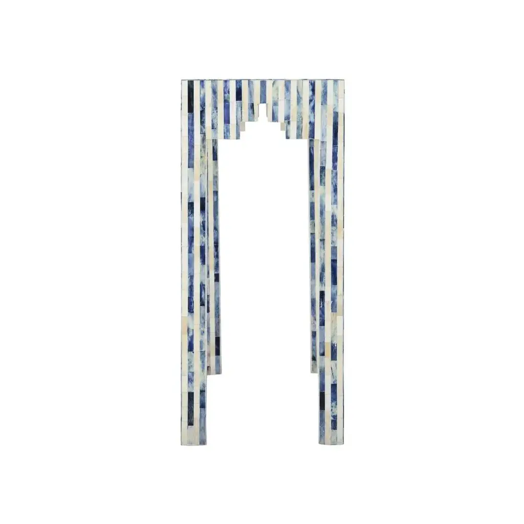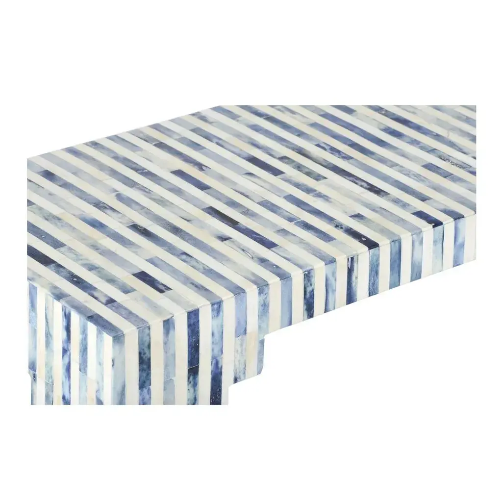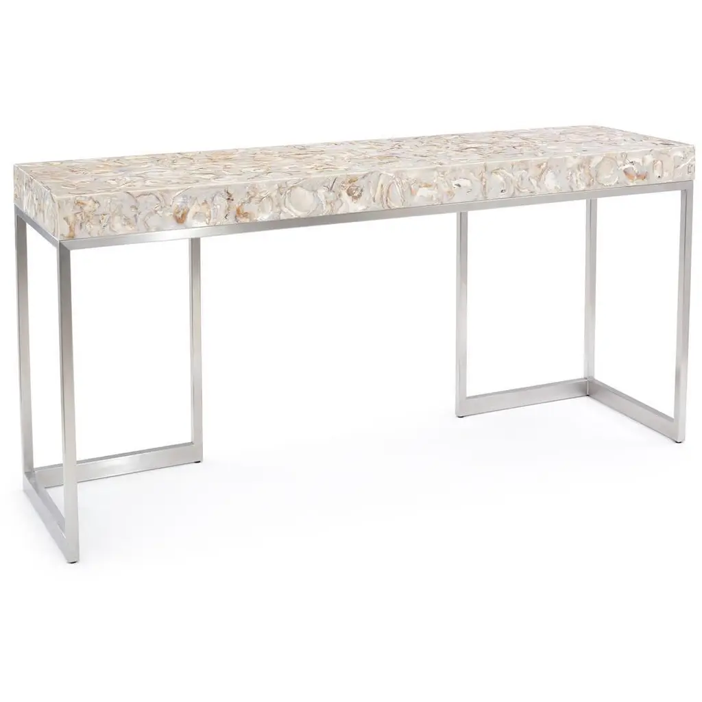 This thin versatile console table features exquisite craftsmanship with hand cut bone inlay.