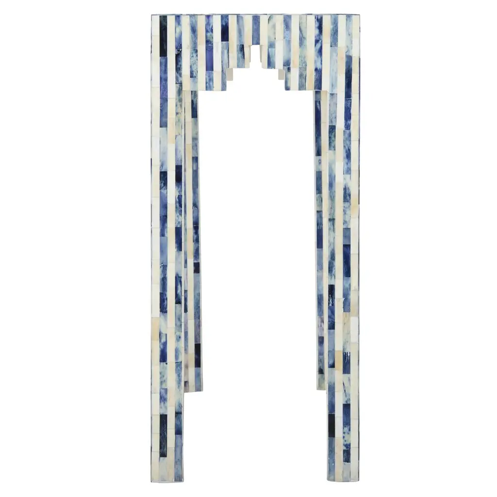 This thin versatile console table features exquisite craftsmanship with hand cut bone inlay.