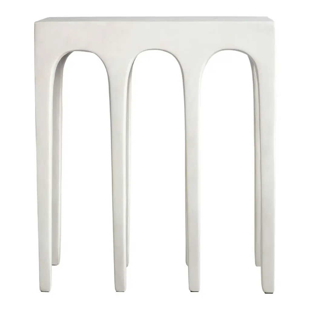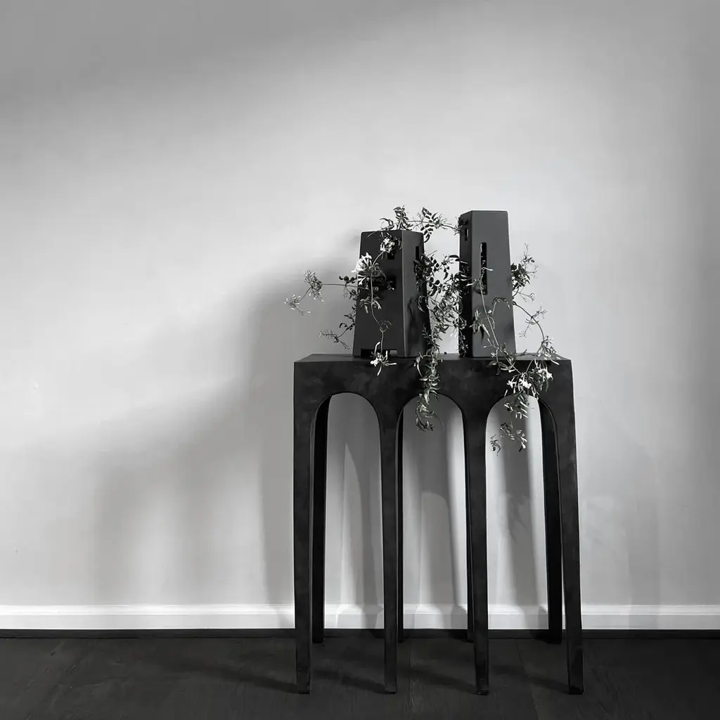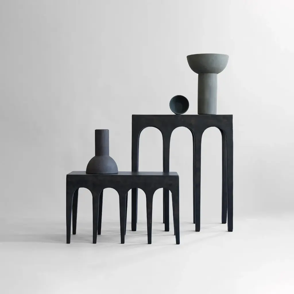 Like a piece of architecture gone astray, the Bow console table draws parallels to the old aqueducts from the Roman Empire and classic architectural geometry. Repetition of arches create a beautiful, sleek, yet somewhat box silhouette and the long legs make it seem narrow and light even though the character is anything but insignificant. The table is cast in lightweight fiber concrete to create a unique textured surface and increase mobility. It is hand painted with multiple layers of paint, creating a strong and resistant surface. Designed by Kristian Sofus Hansen; Tommy Hyldahl.