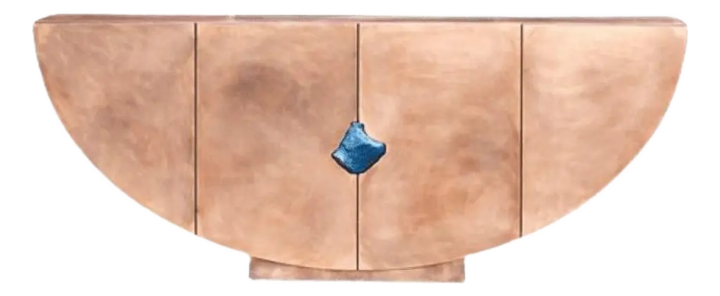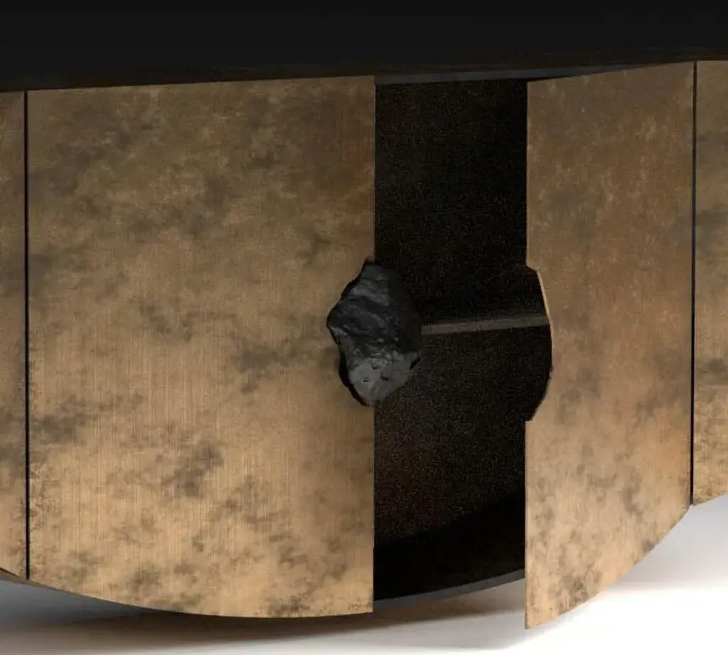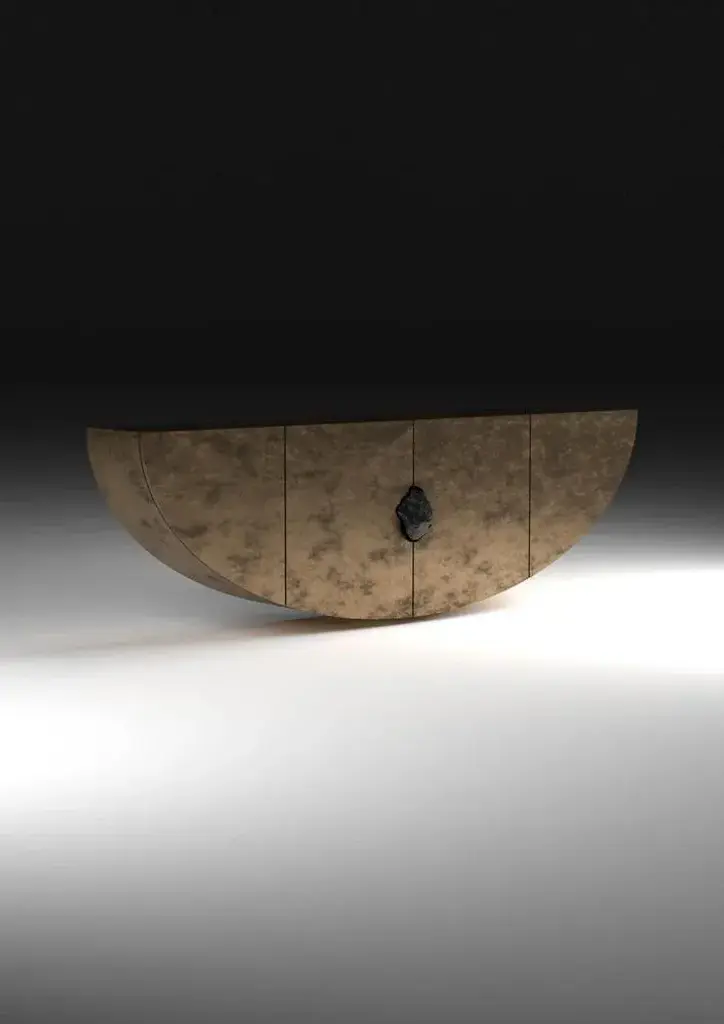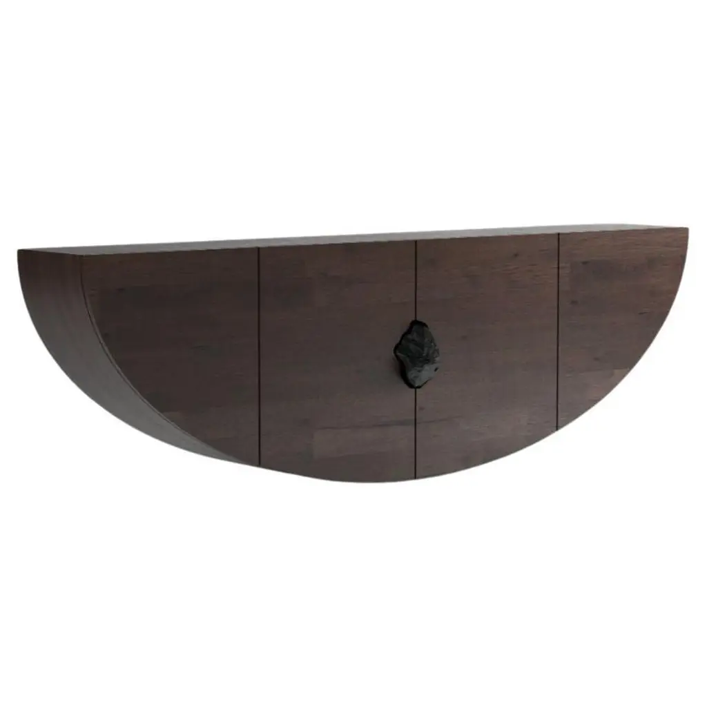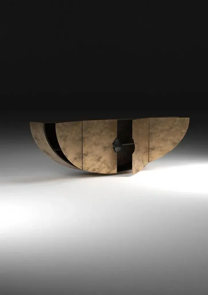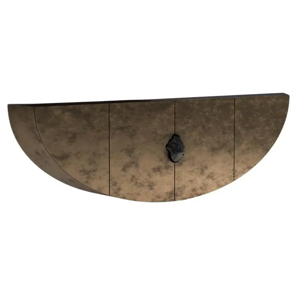 Bow console with noir belge (Standing or hanging) by Pierre De Valck. Dimensions: W 280 x D 60 x H 63cm Materials: Patinated bronze with noir belge Weight: 75 kg. Each piece is unique. Pierre De Valck (1991) born in Brussels, is a Ghent-based designer with a childhood fascination for archeology and collecting historical artefacts. His furniture attempts to harness the power of ancient geological processes in a contemporary bodice. Modern antiquities that allow the rediscovery of an ancestral past. Pierre De Valck manually encrusts each piece of furniture with unique minerals and stones of exceptional historical value. Leaving the minerals untouched, the mere functional is transcended, rendering the pieces both unique and authentic testimonies of our collective memory.