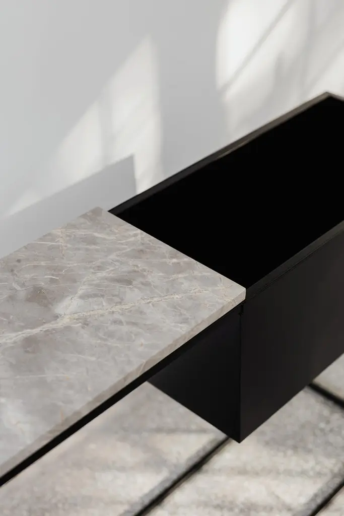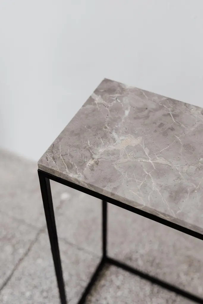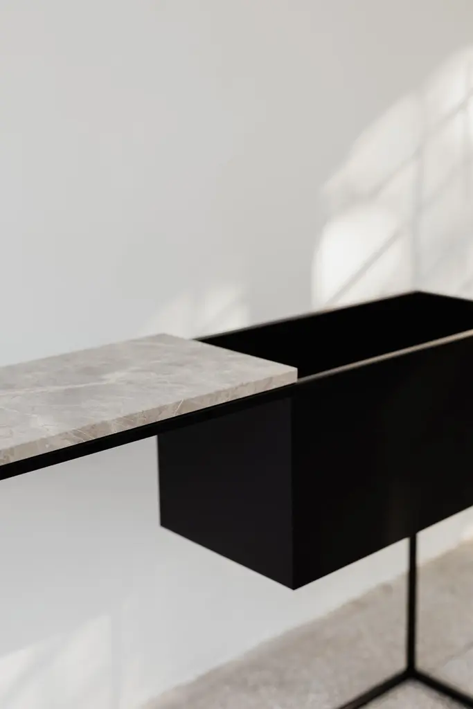 Box Maxi M Grey Console Table by Un’commonDesigned by Małgorzata Korycka.Dimensions: D 28 x W 140 x H 80 cm.Materials: Steel and Fior di Bosco marble.Available in different marble options. Please contact us.BOX MAXI is a fine example of ingenious modern design. It will be a great choice for your hall, living room, or bedroom. It offers a very functional combination of the marble top and lowered shelf – two different, complementary surfaces. The frame and the shelf are made of black-colored steel, and the top is available in two different colors.Our Polish workshop designs and hand-makes furniture from marble and steel. Our furniture should not only be well-designed – it should be a feast for the senses. Nothing can produce this effect quite as good as marble.It is a beautiful, refined, natural material used for centuries in architecture, art, and everyday life. There are many different stone quarries, offering different types and colors of marble. However, because it is a natural material formed in a very complex process, it is virtually impossible to extract two identical pieces of stone. In our opinion, in a world ruled by plastic and mass production, this thrill of surprise is a bit of genuine luxury, reserved only for natural materials and their enthusiasts.Thanks to the physical properties of stone and precise workmanship, Un’common furniture is built to last. Over time, a natural patina may form on the surface, adding extra charm to your beautiful and refined furniture, which – if treated well – will reward you every day. Nothing can beat the taste of coffee when you drink it at a marble table.