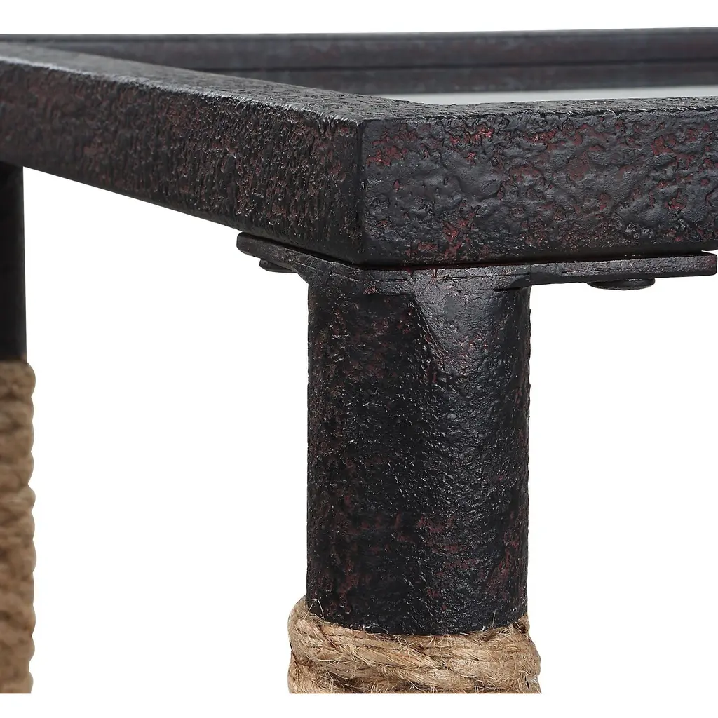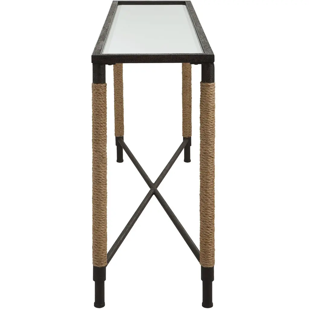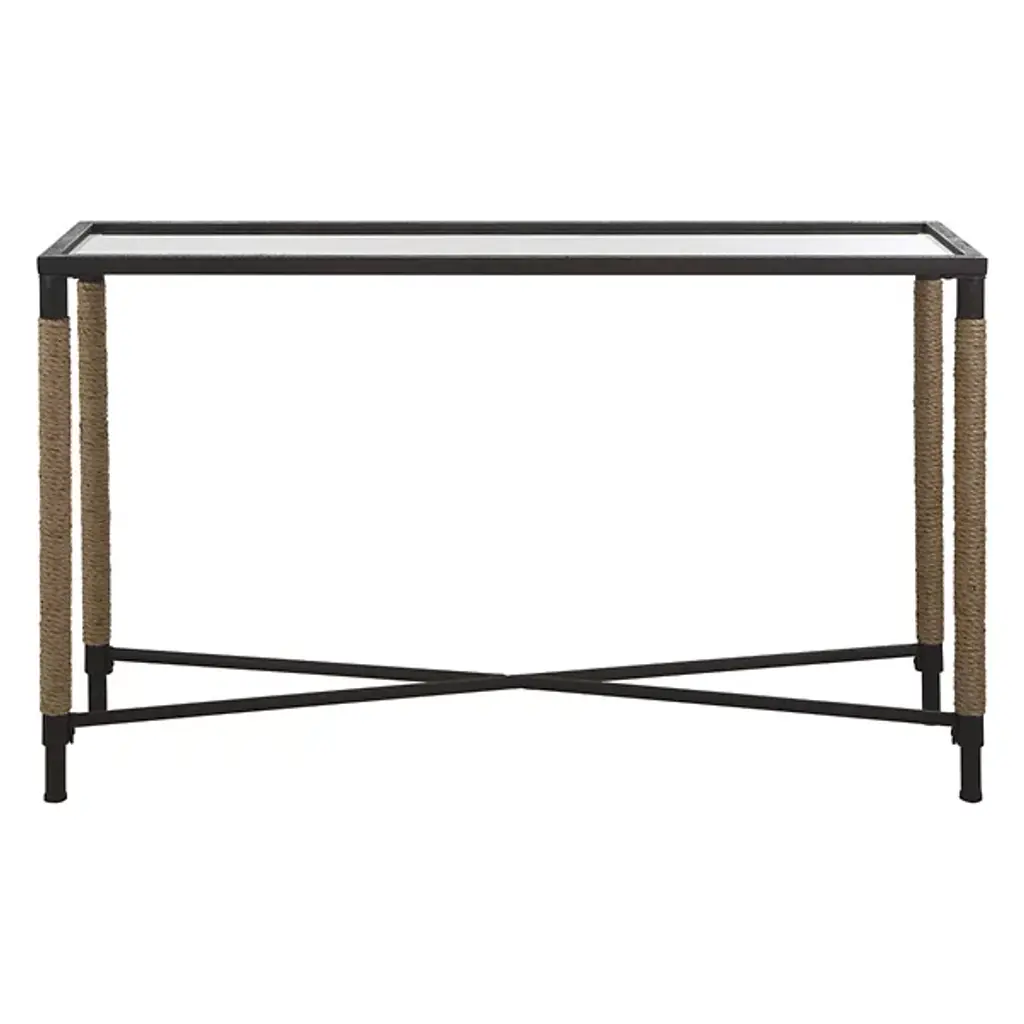 A Nod To Classic Coastal Style, This Console Table Features A Rustic Iron Frame Wrapped In Natural Fiber Rope Accents Topped With A Beveled Mirror.
