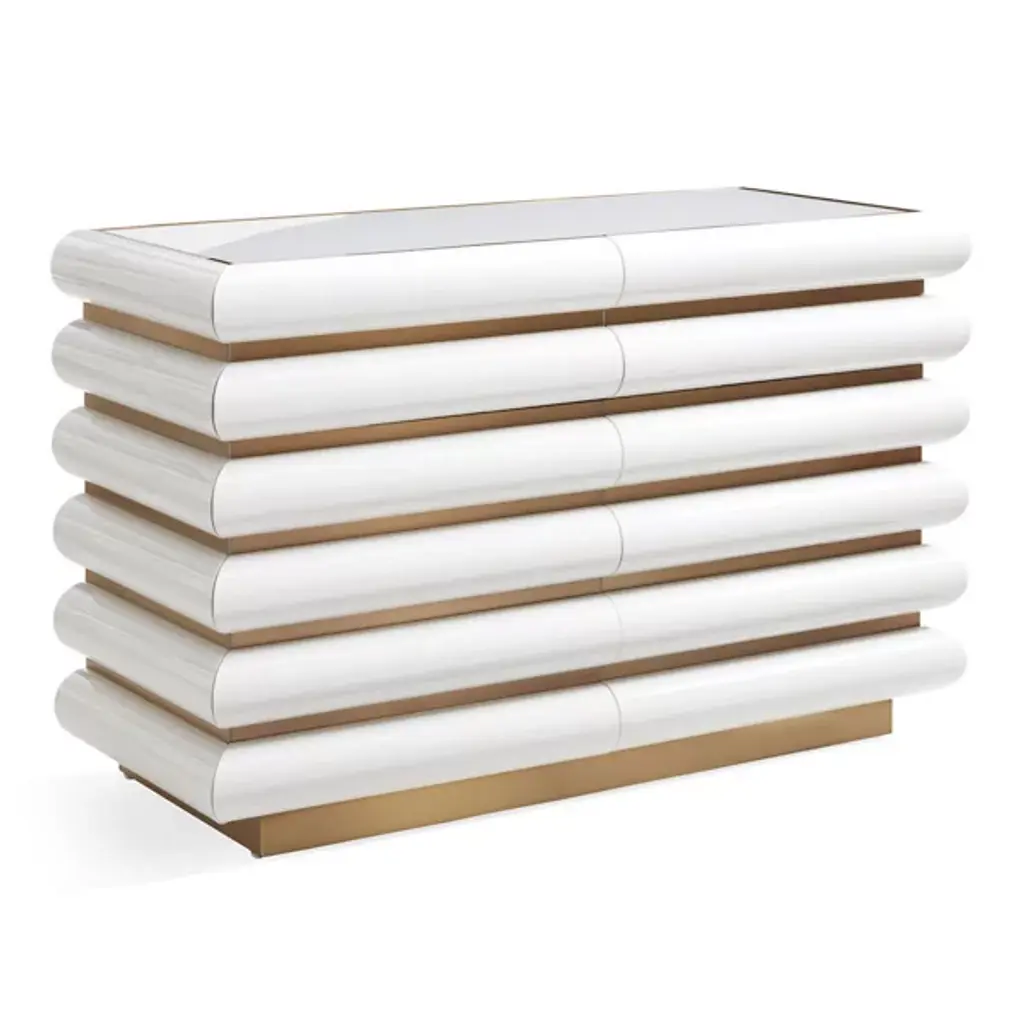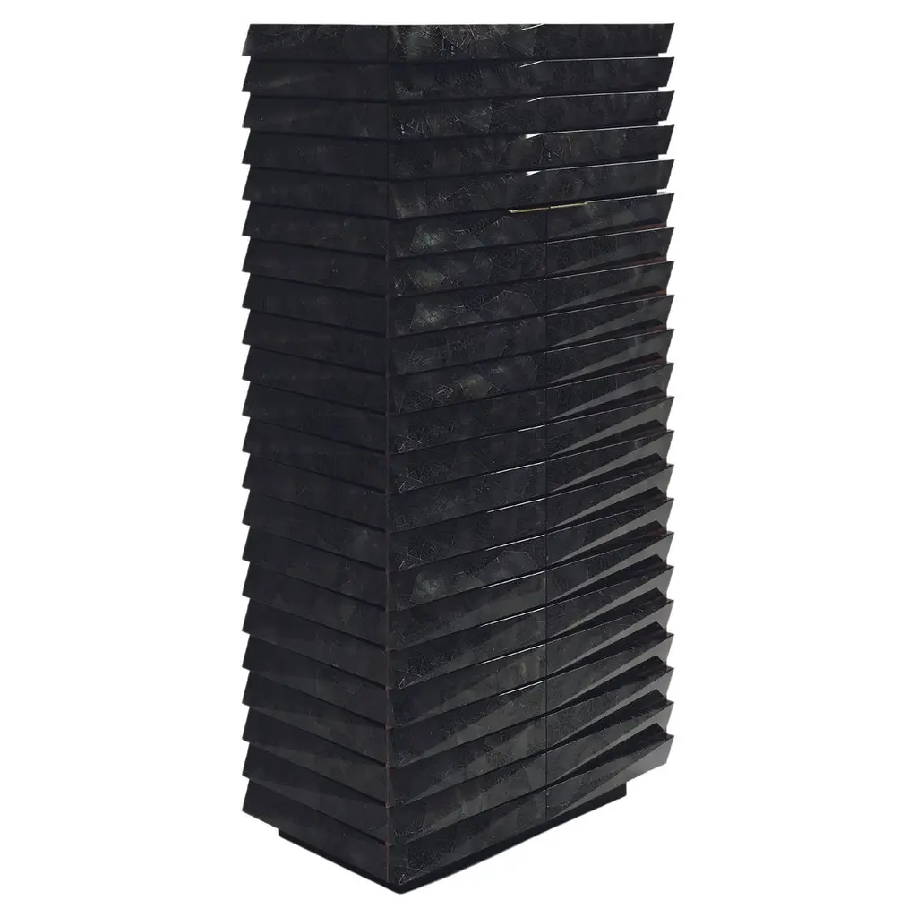 This console was designed to make a stupefying statement in the entryways of exclusive interiors. Achieved thanks to a deft process of manual chiseling, the goldbrick-like elements composing its gleaming structure are arranged in a dynamic way that further enhances its sculptural impact. Equipped with a lined drawer, this superb design gets sealed by a top in prized Lasa marble.