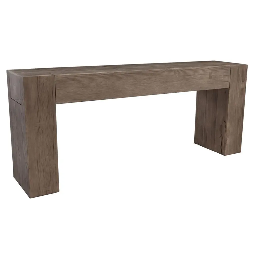 Made from reclaimed oak, the Brissy console table is formed in a classic rectangular shape. Finished in a warm brown hue, each unique piece features natural variations in wood color and surface appearance. Large exposed joinery completes the beautifully rustic design.