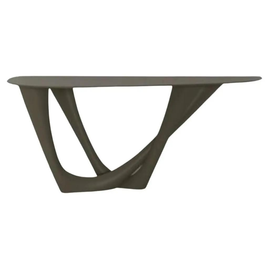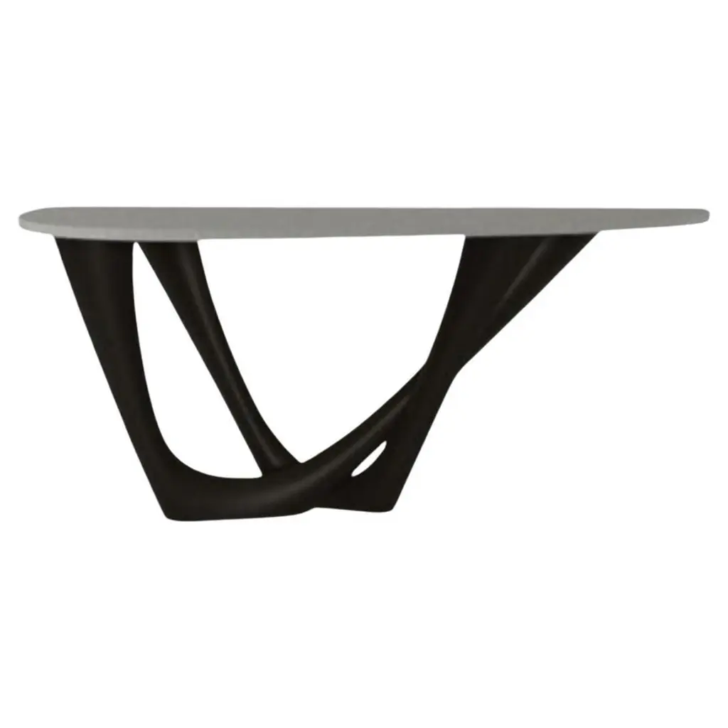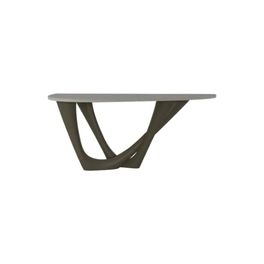Brown G-console duo concrete top and steel base by ZietaDimensions: D 56 x W 168 x H 75 cm Material: Carbon steel, concrete.Also available in different colors and dimensions.G-Console is another bionic object in our collection. Created for smaller spaces, it gives another possibility in interior planning and at the same time preserves the unique shape of the original G-Table. Both objects were made for enthusiasts of bionic forms. Made with FiDU technology, it reminds of vines or tree roots. Nature symbolizes a constant changeability and harmony that comes out of it. A diverse structure refers to both natural forms and processes. G-Console comes in two versions – Mono and Duo.About Zieta: Zietas main goal is to deliver uniqueness and customization in design and construction while keeping the production, transport, and warehousing innovatively efficient.This is how they imagine the future world: Light, durable structures of customized applications produced on demand out of one-of-a-kind parts, yet efficiently.They use a computer-controlled production process. Customized pattern, customized form, customized function, one-of-a-kind product, and outstanding precision are what they deliver.You will find all of this philosophy reflected in the products. They research, they discover new possibilities, they play with forms and they deliver a beautiful, innovative, surprising outcome to people who love the design and who care about design development.They believe their work is a valuable contribution to the world of design not only by the unique beauty of the forms but most of all by opening ultra-innovative opportunities of forming and new paths for the world of the future.