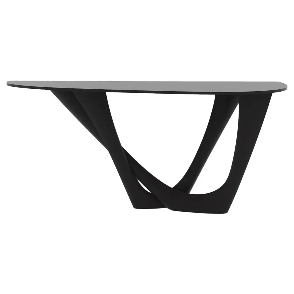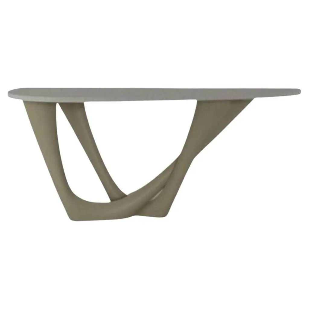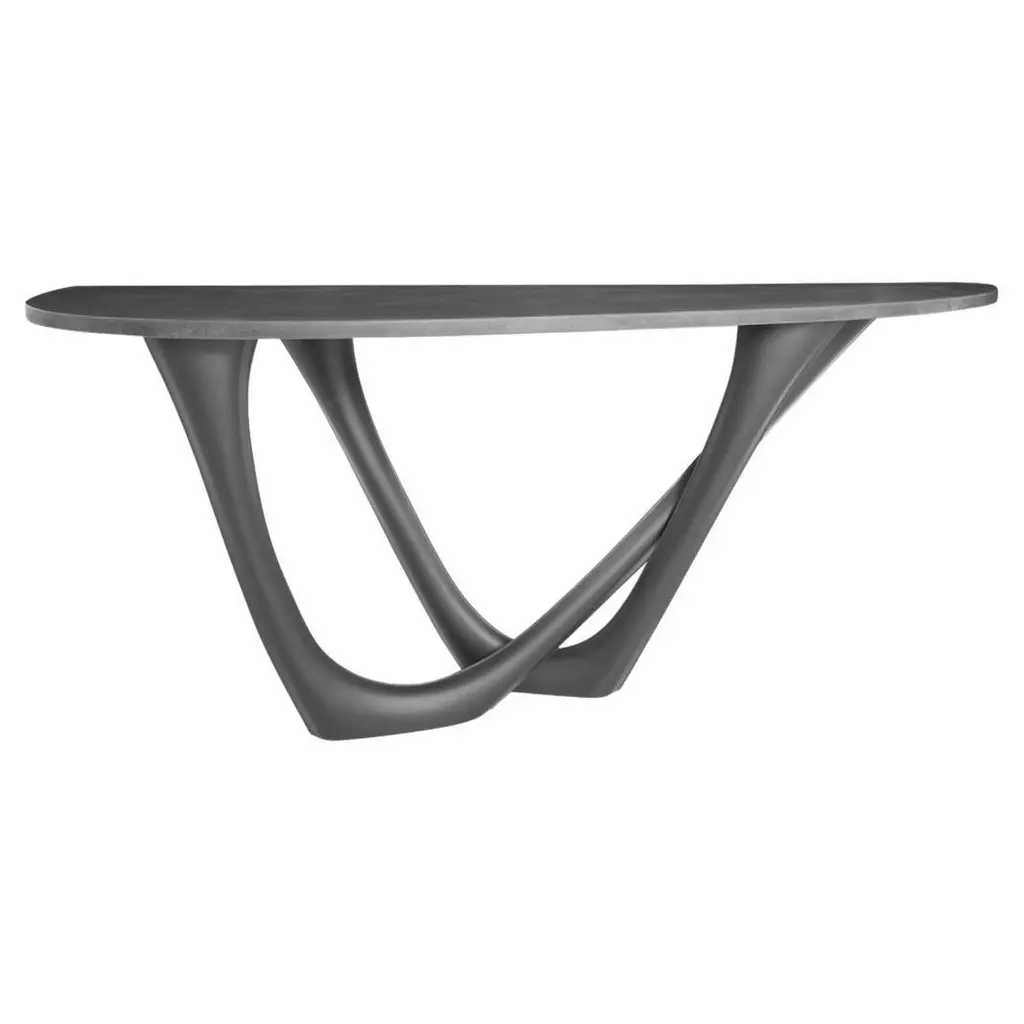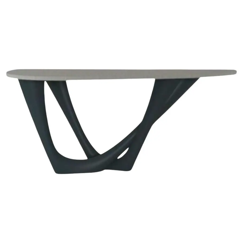 Brown G-console duo concrete top and steel base by ZietaDimensions: D 56 x W 168 x H 75 cm Material: Carbon steel, concrete.Also available in different colors and dimensions.G-Console is another bionic object in our collection. Created for smaller spaces, it gives another possibility in interior planning and at the same time preserves the unique shape of the original G-Table. Both objects were made for enthusiasts of bionic forms. Made with FiDU technology, it reminds of vines or tree roots. Nature symbolizes a constant changeability and harmony that comes out of it. A diverse structure refers to both natural forms and processes. G-Console comes in two versions – Mono and Duo.About Zieta: Zietas main goal is to deliver uniqueness and customization in design and construction while keeping the production, transport, and warehousing innovatively efficient.This is how they imagine the future world: Light, durable structures of customized applications produced on demand out of one-of-a-kind parts, yet efficiently.They use a computer-controlled production process. Customized pattern, customized form, customized function, one-of-a-kind product, and outstanding precision are what they deliver.You will find all of this philosophy reflected in the products. They research, they discover new possibilities, they play with forms and they deliver a beautiful, innovative, surprising outcome to people who love the design and who care about design development.They believe their work is a valuable contribution to the world of design not only by the unique beauty of the forms but most of all by opening ultra-innovative opportunities of forming and new paths for the world of the future.