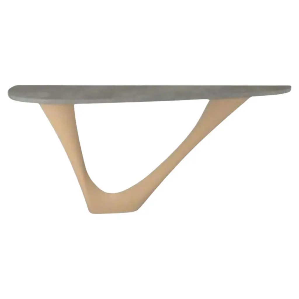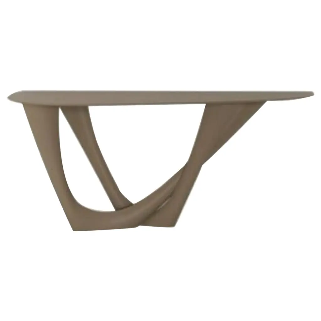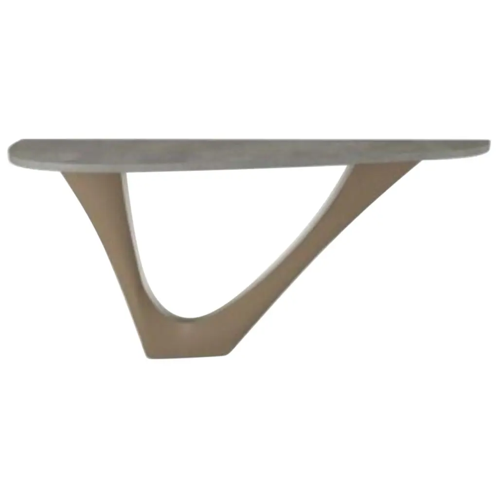 Brown G-Console mono steel base with concrete top by ZietaDimensions: D 43 x W 159 x H 75 cm Material: Concrete, carbon steel.Also available in different colors and dimensions.G-Console is another bionic object in our collection. Created for smaller spaces, it gives another possibility in interior planning and at the same time preserves the unique shape of the original G-Table. Both objects were made for enthusiasts of bionic forms. Made with FiDU technology, it reminds of vines or tree roots. Nature symbolizes a constant changeability and harmony that comes out of it. A diverse structure refers to both natural forms and processes. G-Console comes in two versions – Mono and Duo.About Zieta: Zietas main goal is to deliver uniqueness and customization in design and construction while keeping the production, transport, and warehousing innovatively efficient.This is how they imagine the future world: Light, durable structures of customized applications produced on demand out of one-of-a-kind parts, yet efficiently.They use a computer-controlled production process. Customized pattern, customized form, customized function, one-of-a-kind product, and outstanding precision are what they deliver.You will find all of this philosophy reflected in the products. They research, they discover new possibilities, they play with forms and they deliver a beautiful, innovative, surprising outcome to people who love the design and who care about design development.They believe their work is a valuable contribution to the world of design not only by the unique beauty of the forms but most of all by opening ultra-innovative opportunities of forming and new paths for the world of the future.