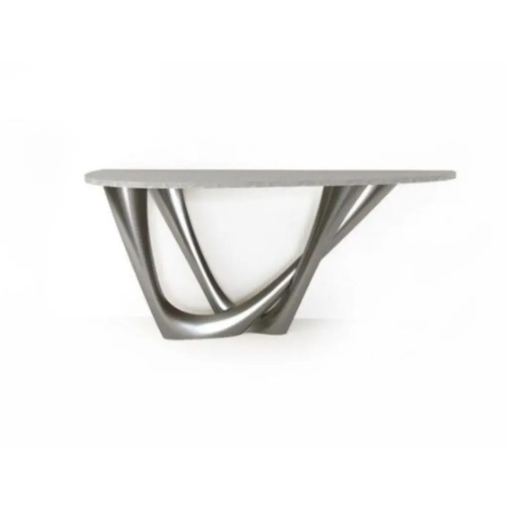 Brushed G-Console concrete top and stainless base by ZietaDimensions: D 43 x W 159 x H 75 cm Material: Stainless steel, concrete.Also available in different colors and dimensions.G-Console is another bionic object in our collection. Created for smaller spaces, it gives another possibility in interior planning and at the same time preserves the unique shape of the original G-Table. Both objects were made for enthusiasts of bionic forms. Made with FiDU technology, it reminds of vines or tree roots. Nature symbolizes a constant changeability and harmony that comes out of it. A diverse structure refers to both natural forms and processes. G-Console comes in two versions – Mono and Duo.About Zieta: Zietas main goal is to deliver uniqueness and customization in design and construction while keeping the production, transport, and warehousing innovatively efficient.This is how they imagine the future world: Light, durable structures of customized applications produced on demand out of one-of-a-kind parts, yet efficiently.They use a computer-controlled production process. Customized pattern, customized form, customized function, one-of-a-kind product, and outstanding precision are what they deliver.You will find all of this philosophy reflected in the products. They research, they discover new possibilities, they play with forms and they deliver a beautiful, innovative, surprising outcome to people who love the design and who care about design development.They believe their work is a valuable contribution to the world of design not only by the unique beauty of the forms but most of all by opening ultra-innovative opportunities of forming and new paths for the world of the future.