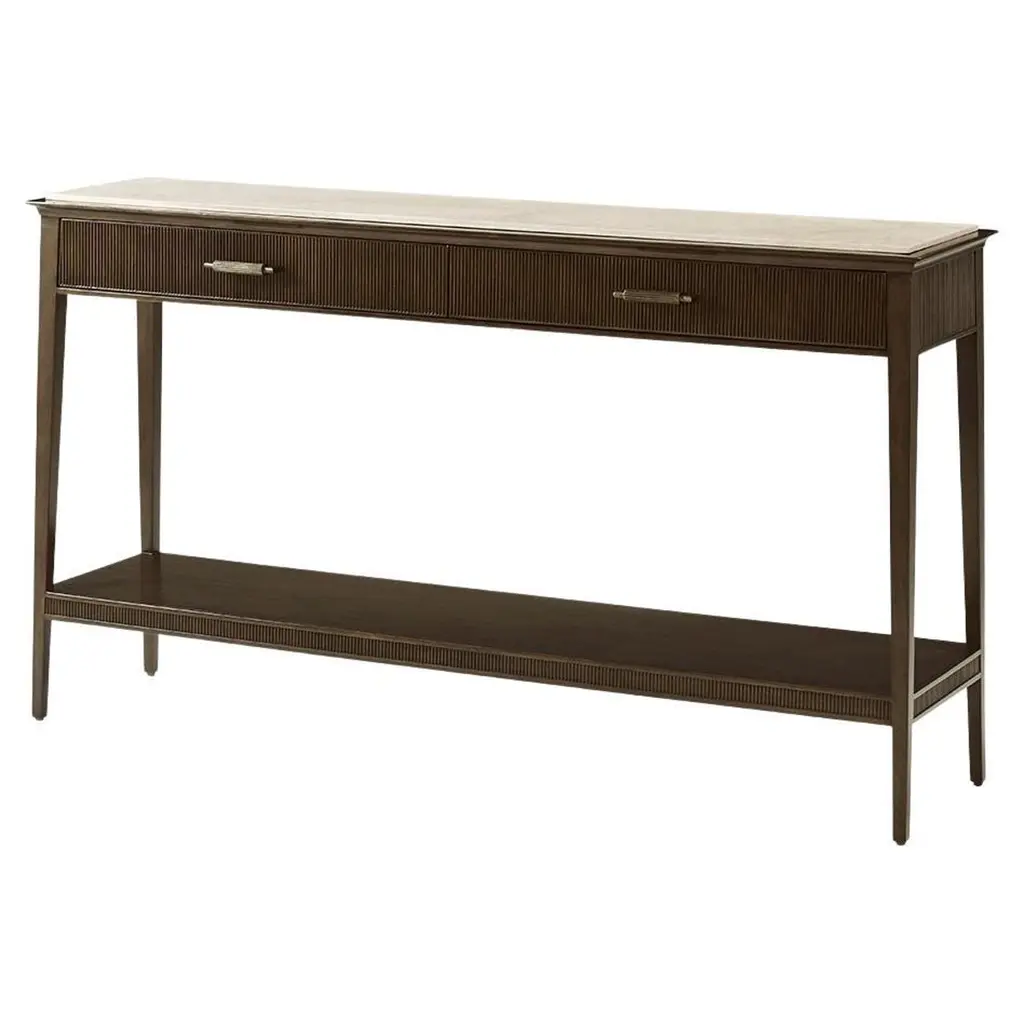 494600-MBL Late Regency style mahogany console table with antiqued finish, two drawers above a shaped under tier set between elegant fluted tapering legs topped with paterae.