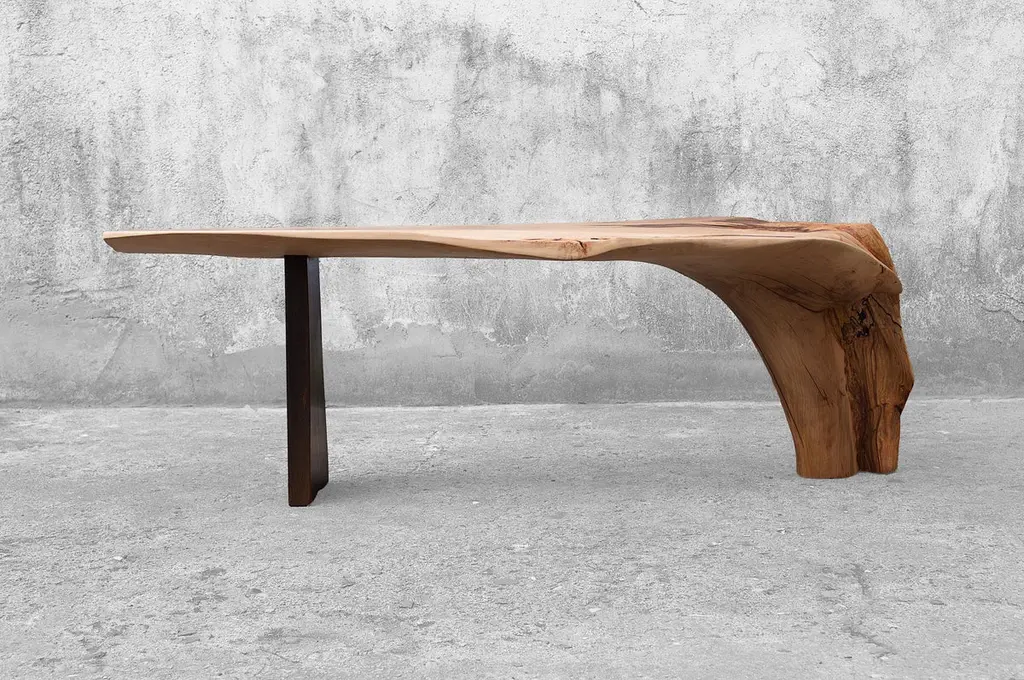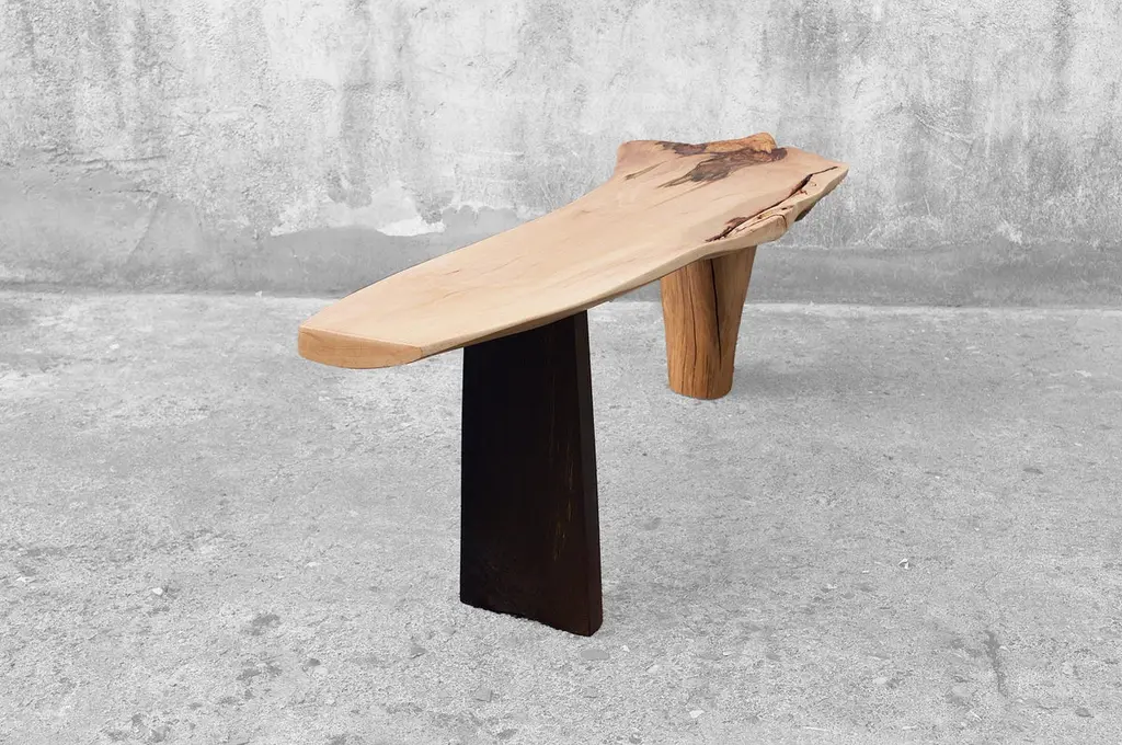 C1166 Console Table in Beech And Smoked Oak Wood by Jörg PietschmannDimensions: D 40 x W 154 x H 51 cm.Materials: Beech and smoked oak.In Pietschmann’s sculptures, trees that for centuries were part of a landscape and founded in primordial forces tell stories inscribed in the memory of their fibers.The forms Jörg Pietschmann pares from ancient trees are extensive and astonish with their physical presence, a combination of elegance and primeval nature. Pietschmann’s sculptures are monuments to the trees from which they derive.Being endowed with the ruggedness of primeval matter gives them a veritable vitality: figures that appear to have grown into their sculptural form of their own accord. But Pietschmann’s tangibly present bodies have undergone a considerable degree of metamorphosis.In order to generate these unique tree specimens he examines the tree’s morphology and intrinsic inner map until the courses of its grain, of a curve, knots and cracks concur with his projections. The exploratory process is accompanied by constant modification, giving at the start of each new piece no more than an intimation of the figure that will later emerge. In their completion, Pietschmann’s sculptures once more become universal form.Jörg Pietschmann`s workshop is situated on the countryside close to Hamburg. He works with indigenous timber as oak, lime tree, beech, poplar, olive tree and maple felled by the wind or human hand, together with tropical timber found on his travels.