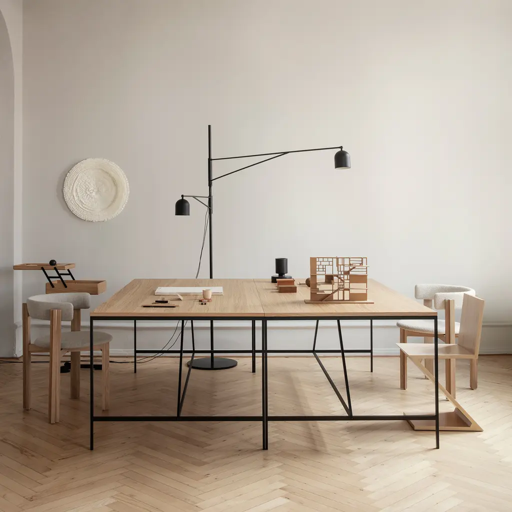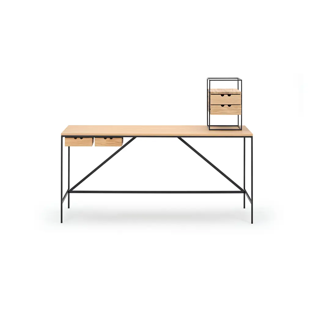 From home offices to living rooms and hallways, the Karakter Cache Console Table is perfect for any space where you need a place to work, display and store items, or organize accessories. Designed by Paul McCobb, this table is elegant and airy thanks to an extra-slim metal frame and a thin wood top. While the steel frame boasts a black powder-coated finish, the top features an oak veneer with a light, natural color and a clear lacquer. The Karakter Cache Console Table comes on its own or with two optional solid wood drawers that attach underneath the top and feature rounded cut-outs for handles. Furthermore, this table is also perfect to use with the Cache Organizer from the same series.