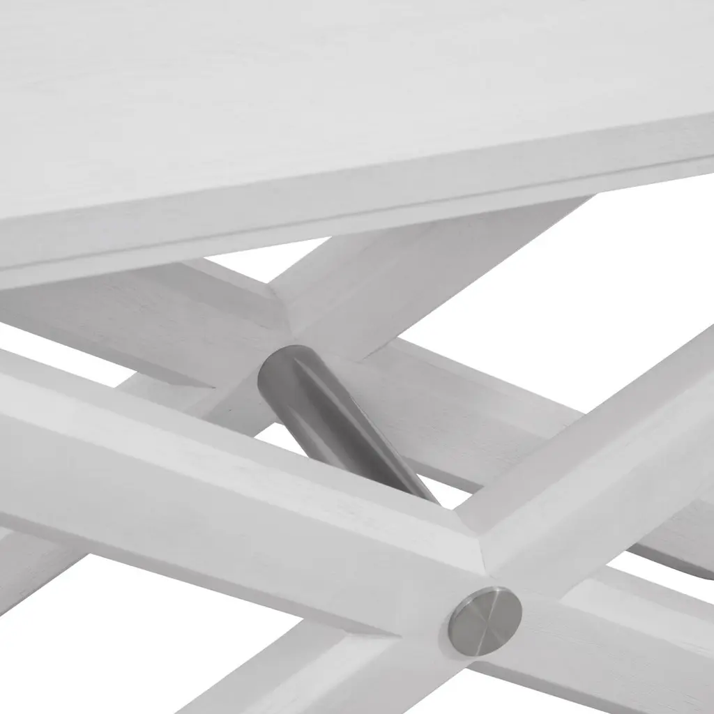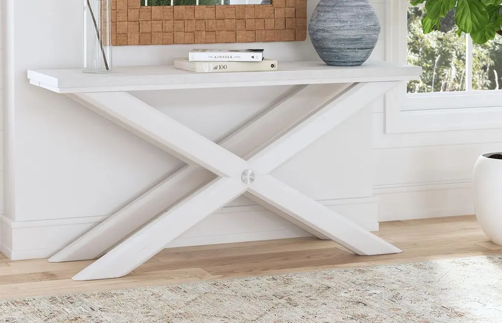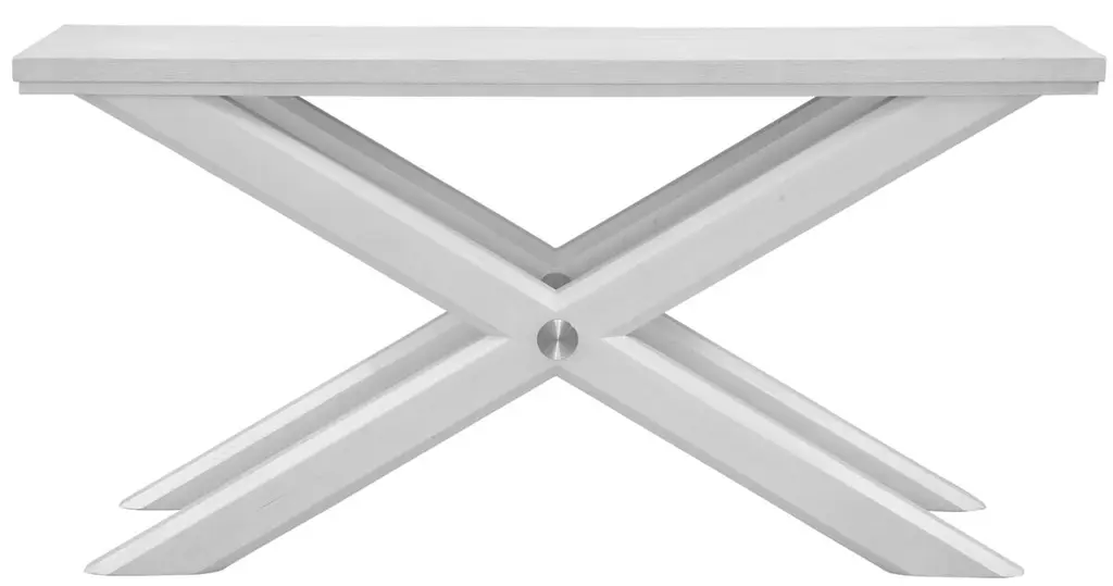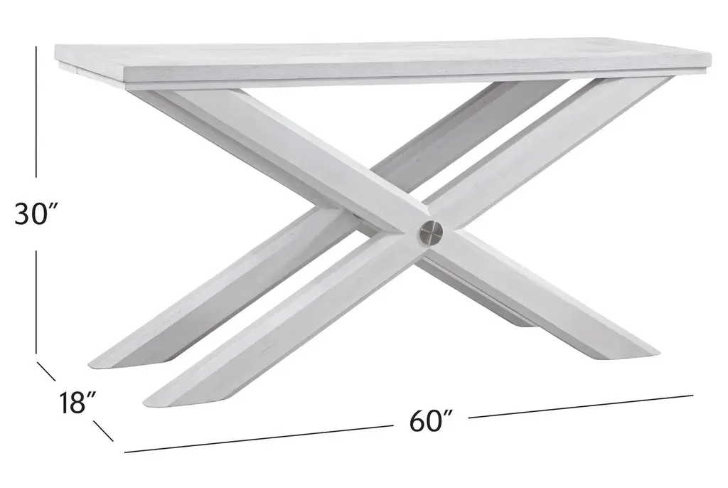 The Cairo Console Table features a coastal contemporary inspired design that is constructed with solid wood and veneers. The table base showcases a heavy octagonal shaped X-base and a metal cross-bar, offering a stylish and sturdy addition to any space.