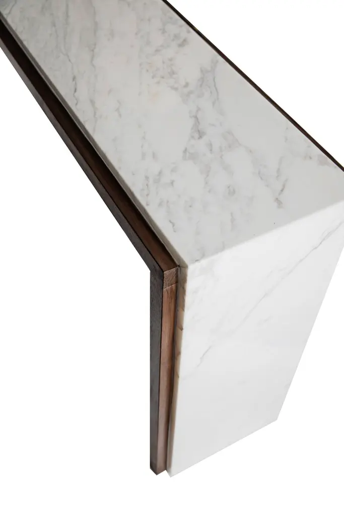 The modern Calista console elevates the Classic runway Silhouette. With your choice of exotic marble, it makes for an amazing statement piece. We have also used it as a desk, a buffet and a sofa table. Place two of our Coco ottomans underneath for extra seating.