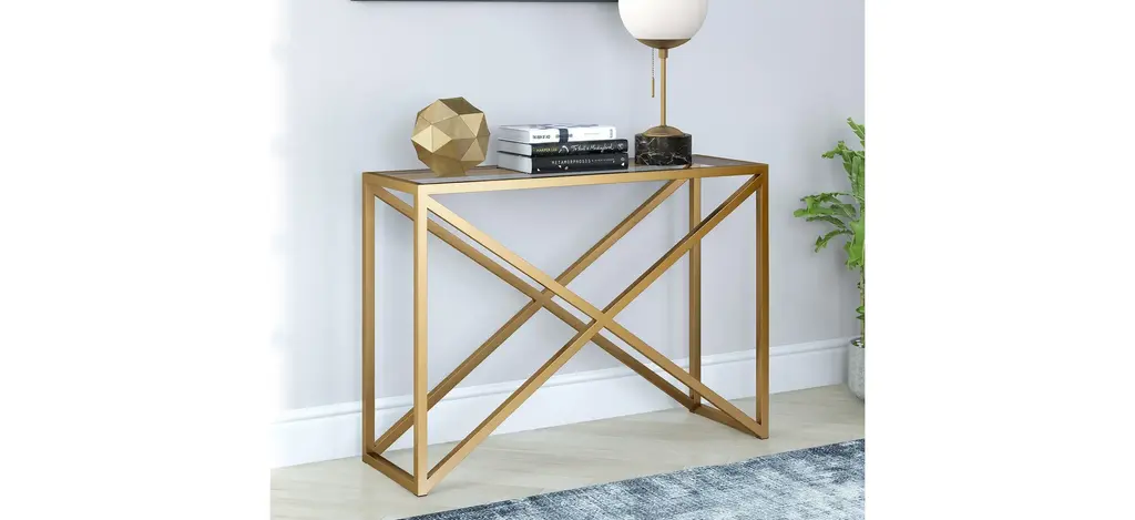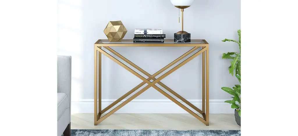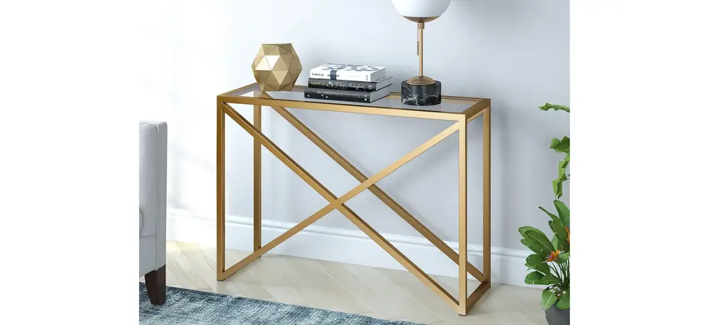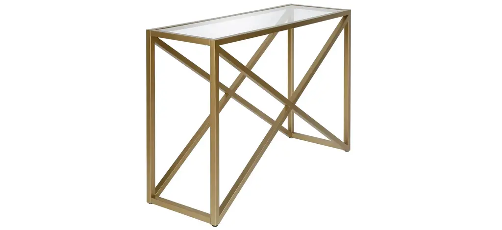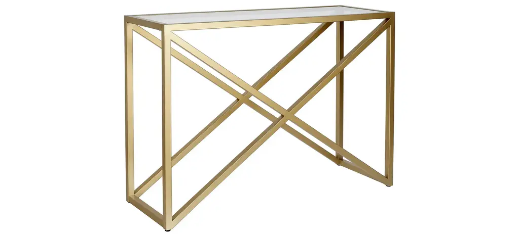 This urban inspired accent table is the perfect pick for your living room or den ensemble. Its base features x-shaped legs creating geometric interest. The top is a transparent tempered glass which shows off the architectural connection and carries the structured design through the frame.