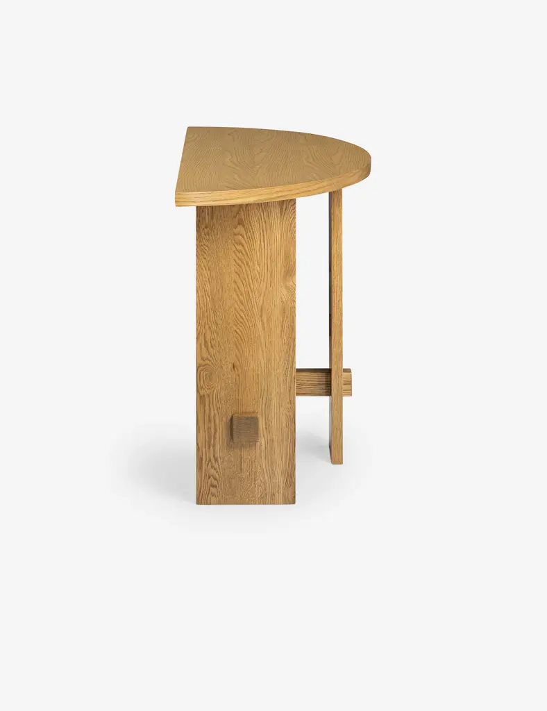 The Campos console table offers a grounding warmth with its blend of oak veneers and solid oak clad in a light finish that showcases the natural grain. The pared-down design features an architectural plank base inspired by the furniture of the American Southwest. We love the soft lines of the half-moon shape as an entryway or sofa table in a high-traffic room.