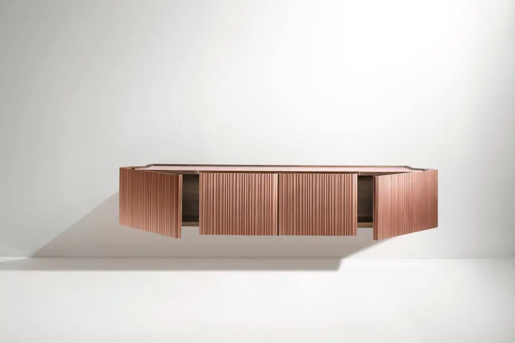 Canneto Wall Mounted Console by De CastelliDimensions: W 234 x D 41 x H 45 cmMaterials: Brushed Copper, Canaletto Walnut WoodBrass and Stainless Steel versions available. Smaller version of the Canneto Console also available. Please contact us for any request.The sculptural surface is defined by fluting composed of vertical rods of different sizes in brushed metal, creating irregular undulations and a fascinating interplay of reflections. Extending horizontally, it has two L-shaped doors that open at 90 degrees thanks to their unique design, while at the center two large basket-style drawers each nestle a smaller drawer within them. The metal top is set slightly lower than the doors and the perimeter of the piece, highlighting the frame in black walnut, a precious wood that has also been used on the inside of the unit to create haute sophistication. The console comes in a wall-mounted or a free-standing version. The slightly recessed top is exceptionally practical as a support for many different items.DE CASTELLI“HARD COUTURE”Faithful to its decision to reinstate the special role of metal in design and experimentation, De Castelli infuses artisan ideas and workmanship into industrial processes, leading to entirely original results. The encounter with design inspires an approach to materials founded upon respect for their potential, be it hidden or obvious, which emerges slowly in a collection of pieces that, despite being part of a series, remain unique.Unique not only for the hand that has created them, but also for the singular cultural path that focuses on the aesthetic (and not just practical) value of the primordial material with which De Castelli shapes living spaces.A BESPOKE APPROACHEach object, even in the repetition of form, is a creative act in and of itself, one that incorporates a heritage of constantly-evolving expertise and research. The equation that relegates ‘cold’ metals to the margins of furnishing projects is thus overturned, bringing iron, brass and copper, in their infinite variations and finishes, to the centre of an entirely renewed stage, allowing them to finally shine with their own light.SUSTAINABILITYDe Castelli has always been committed to making the entire production cycle increasingly sustainable, aware that metal, the material with which its business identifies itself, is precious and must be treated with care, without waste.PEOPLE FIRSTThe wide spaces of the De Castelli headquarters in Crocetta del Montello (TV) allow those who work to enjoy environments where order, cleanliness and safety are always maintained and guaranteed. An attitude of attention and respect for people that has led to the shared ethical code.