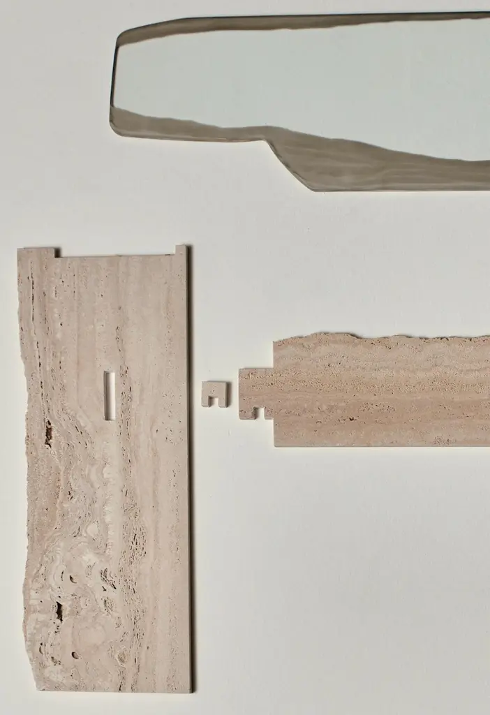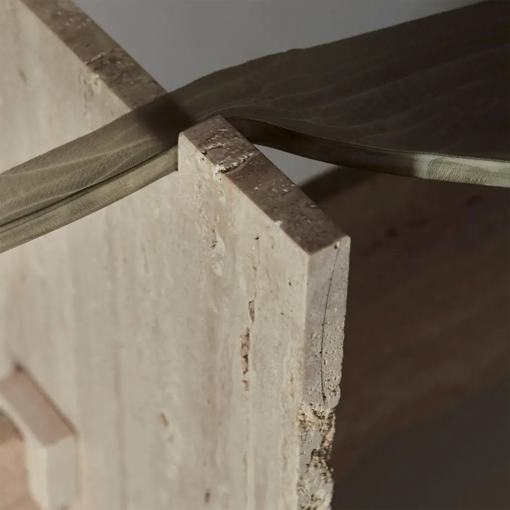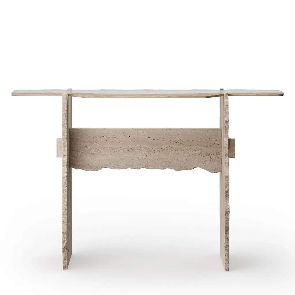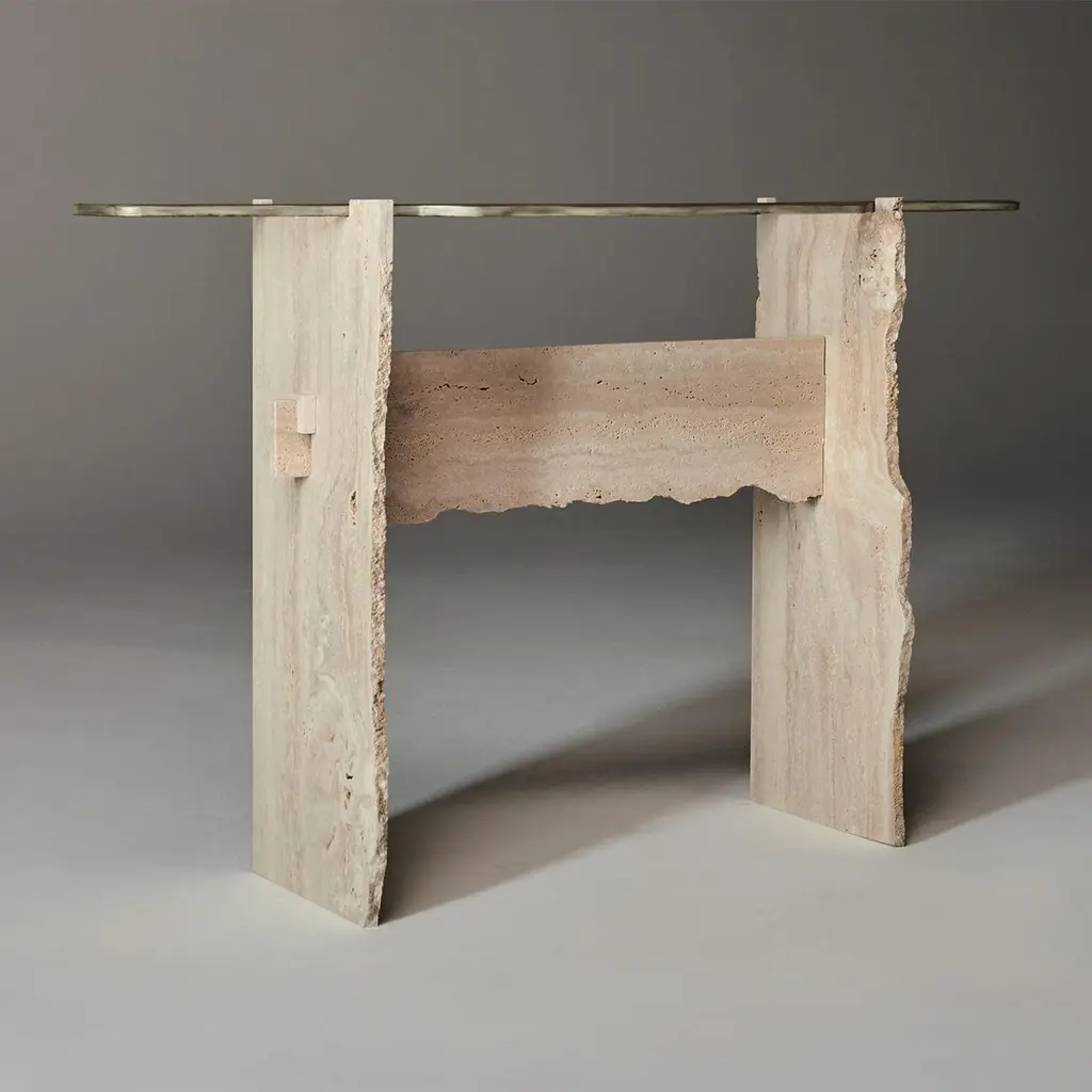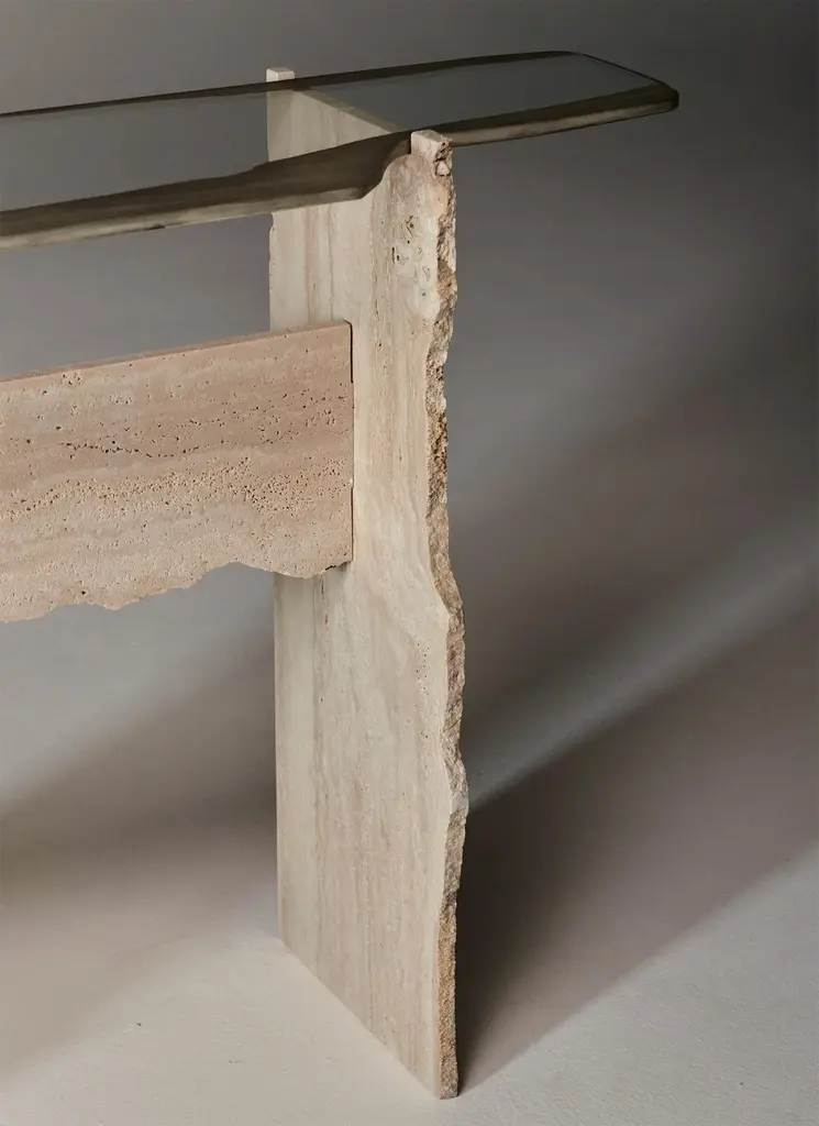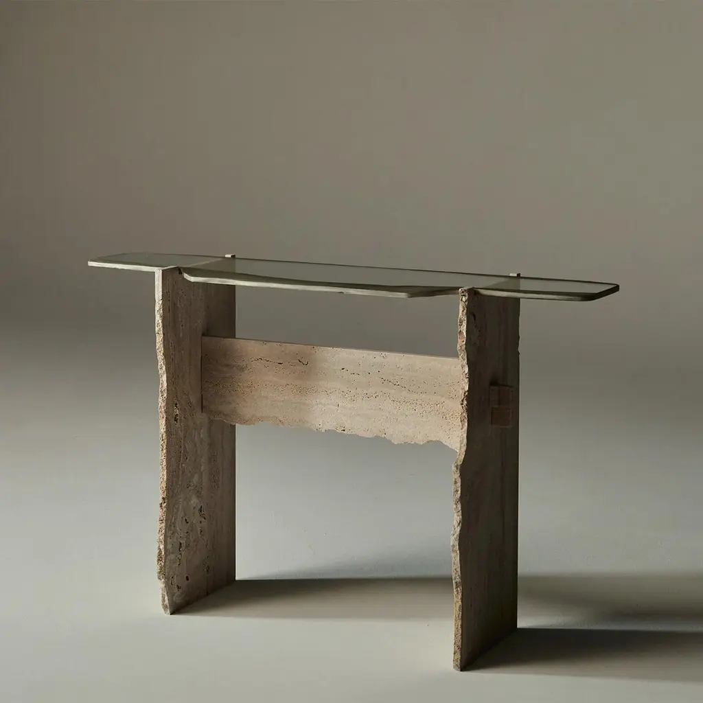 Console Table Careletto Travertine with clear glass top with crackeled bronzed pattern each side and withtravertine base with 1 irregular edge on each part ofthe base.