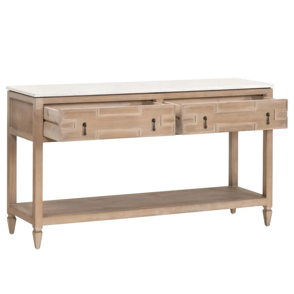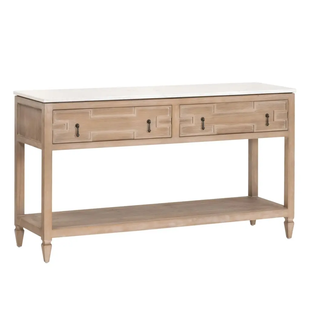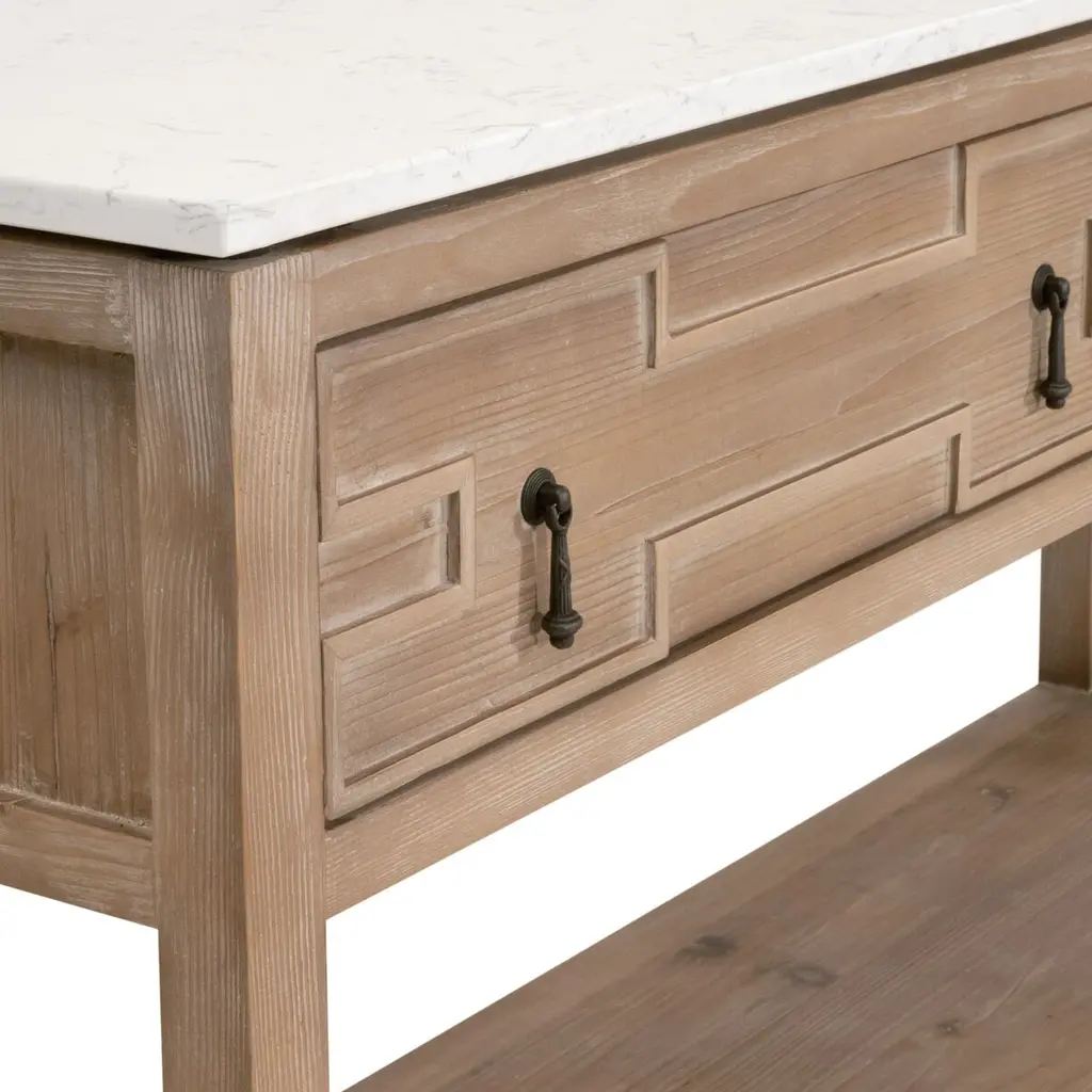 The exquisite Carla 2-Drawer Entry Console will make a beautiful addition to any living room, bedroom, or foyer. This quartz-topped console can also function as a sofa table, entryway table, or media stand. It is constructed with a solid quartz top designed to resemble marble, and a solid reclaimed pine wood base. Measuring 54” wide, 16.25” deep, and 30.25” high, it features two storage drawers and a single shelf. These features allow ample storage space within this transitional-style console table. The one-of-a-kind reclaimed wood adds character with its unique markings and characteristics, while the quartz top adds sophisticated beauty.