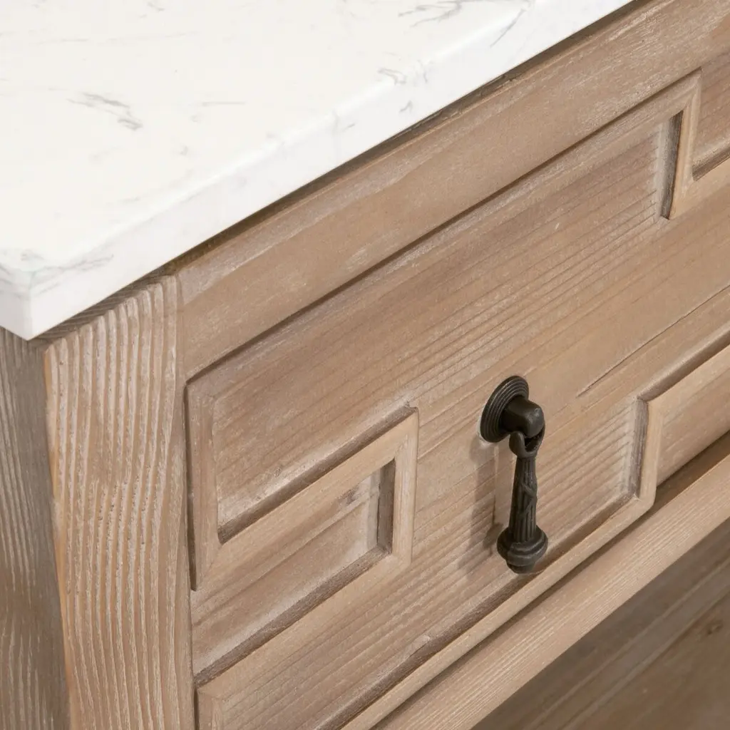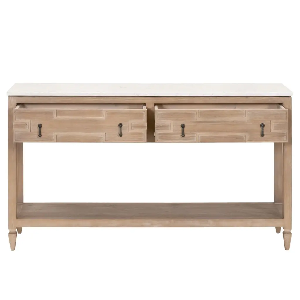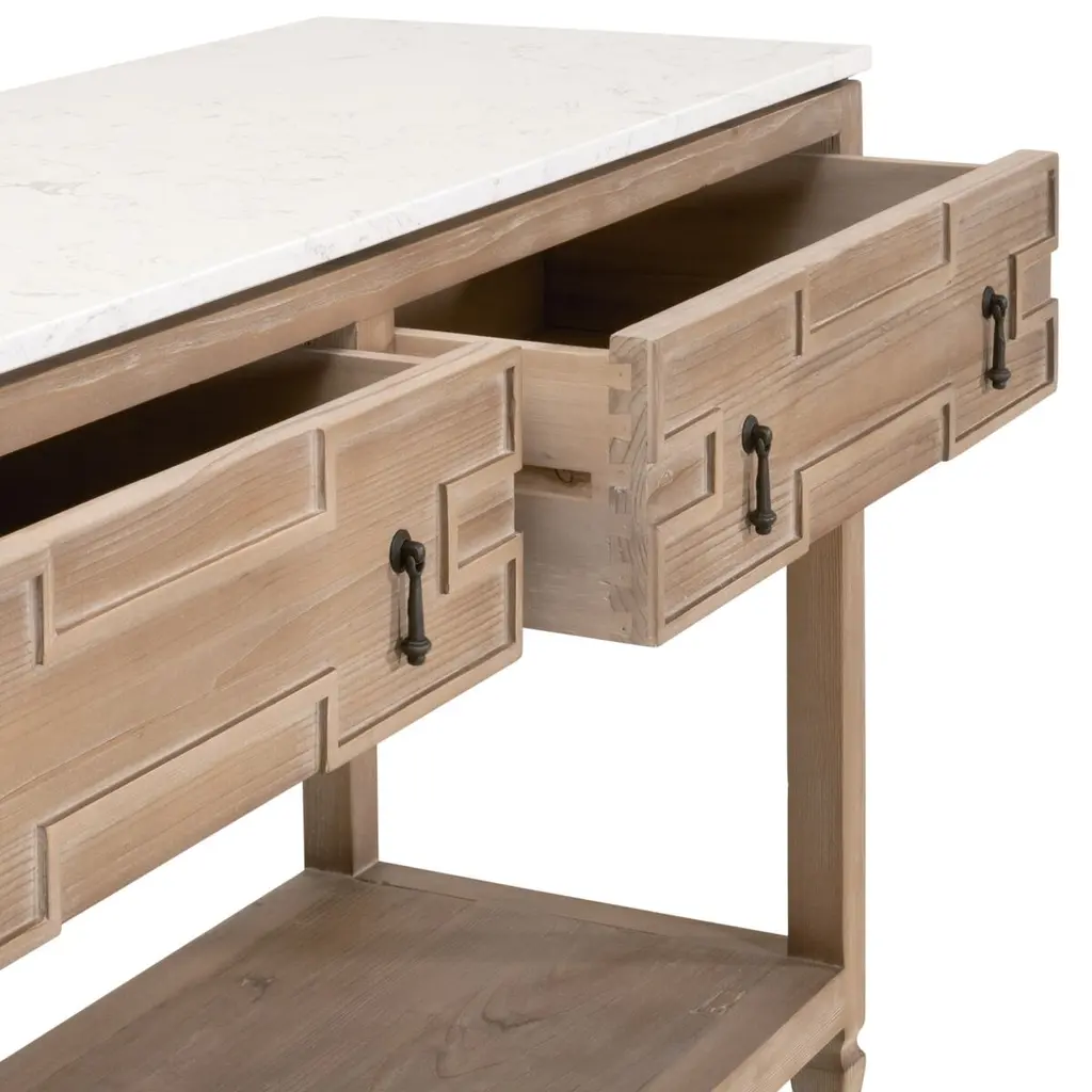 The exquisite Carla 2-Drawer Entry Console will make a beautiful addition to any living room, bedroom, or foyer. This quartz-topped console can also function as a sofa table, entryway table, or media stand. It is constructed with a solid quartz top designed to resemble marble, and a solid reclaimed pine wood base. Measuring 54” wide, 16.25” deep, and 30.25” high, it features two storage drawers and a single shelf. These features allow ample storage space within this transitional-style console table. The one-of-a-kind reclaimed wood adds character with its unique markings and characteristics, while the quartz top adds sophisticated beauty.