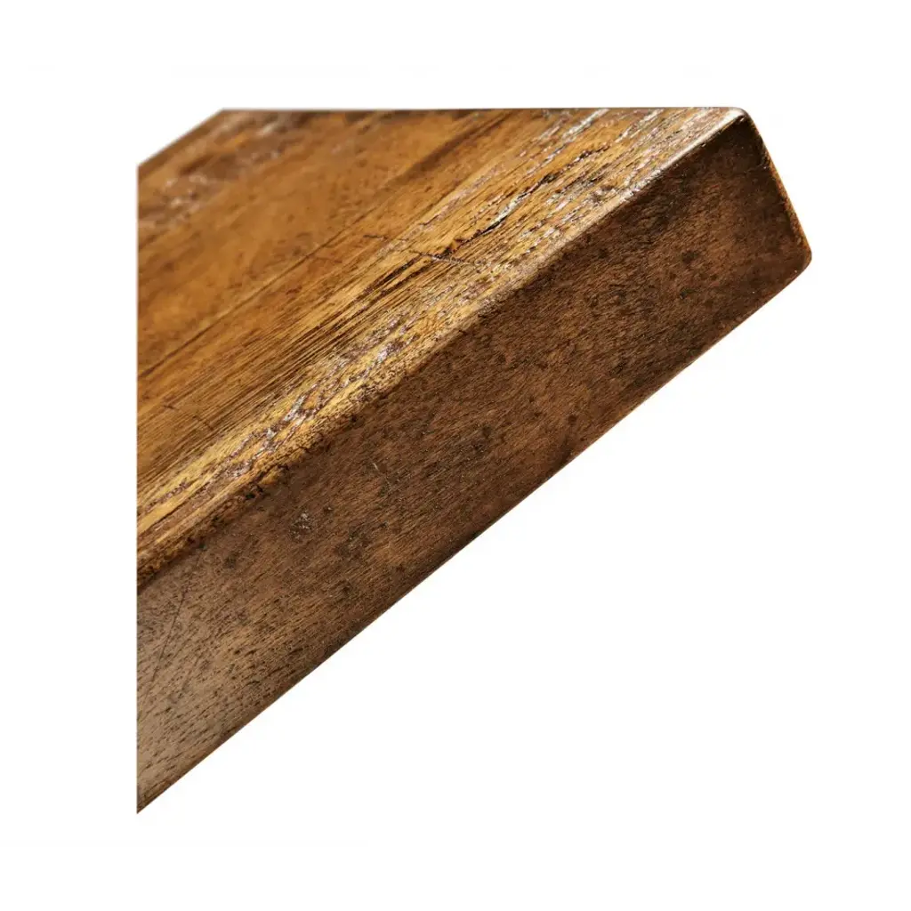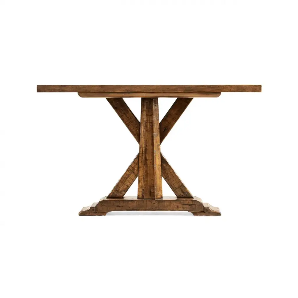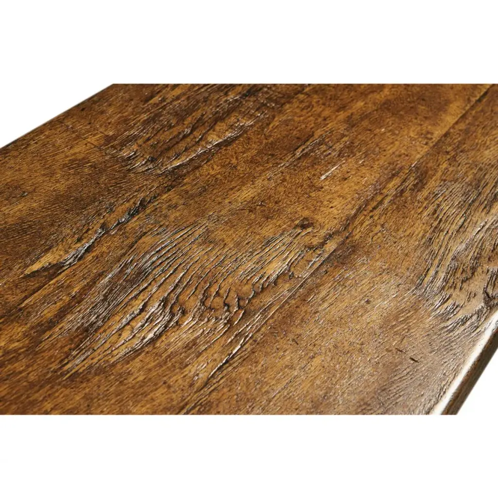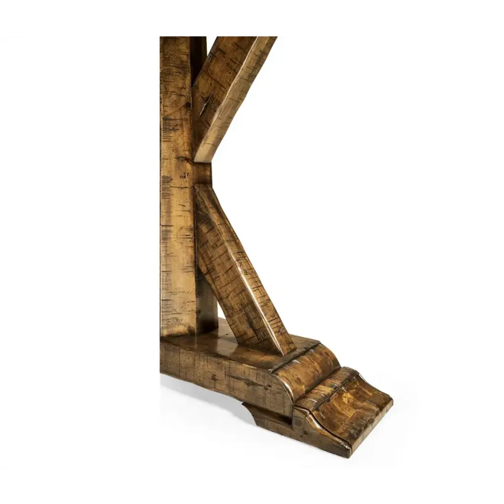 491057-CFW Narrow rectangular console table with a rustic finish showing exposed saw marks and of a traditional construction in country walnut.