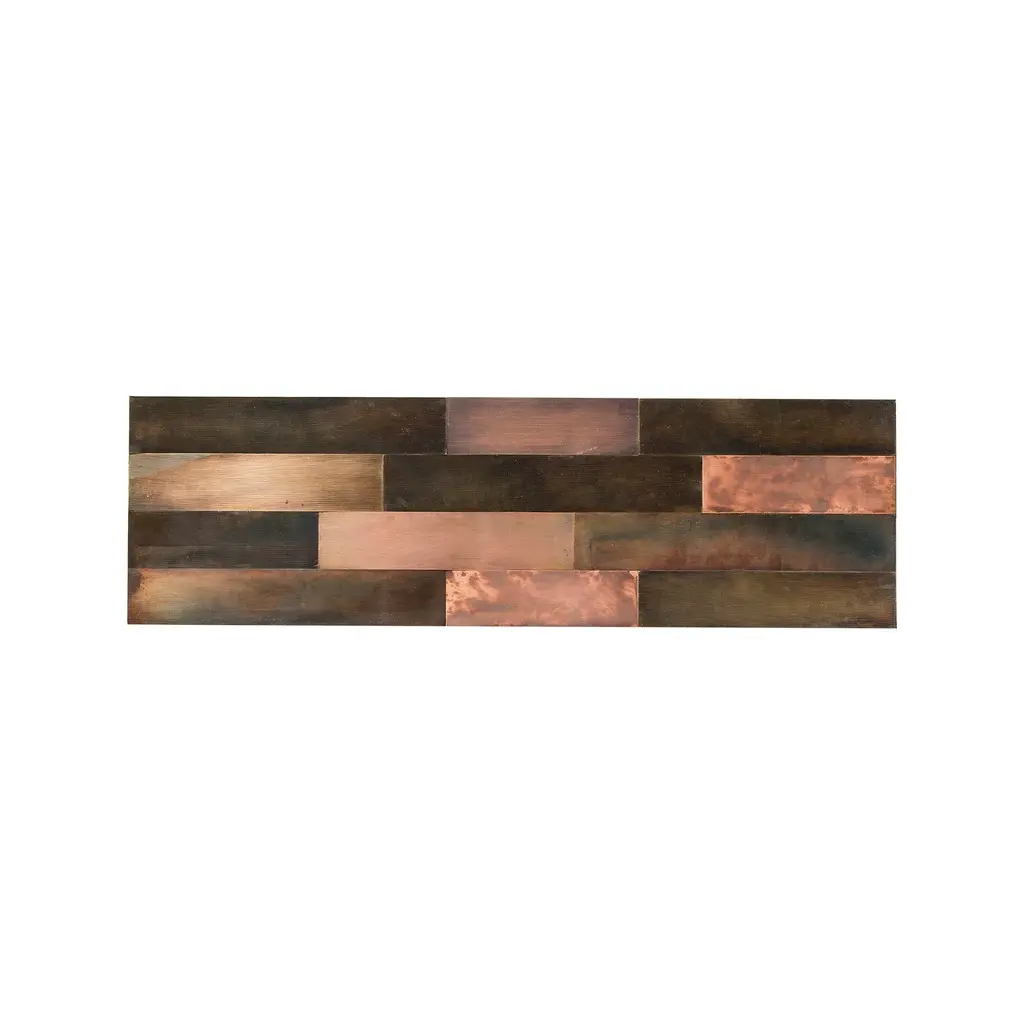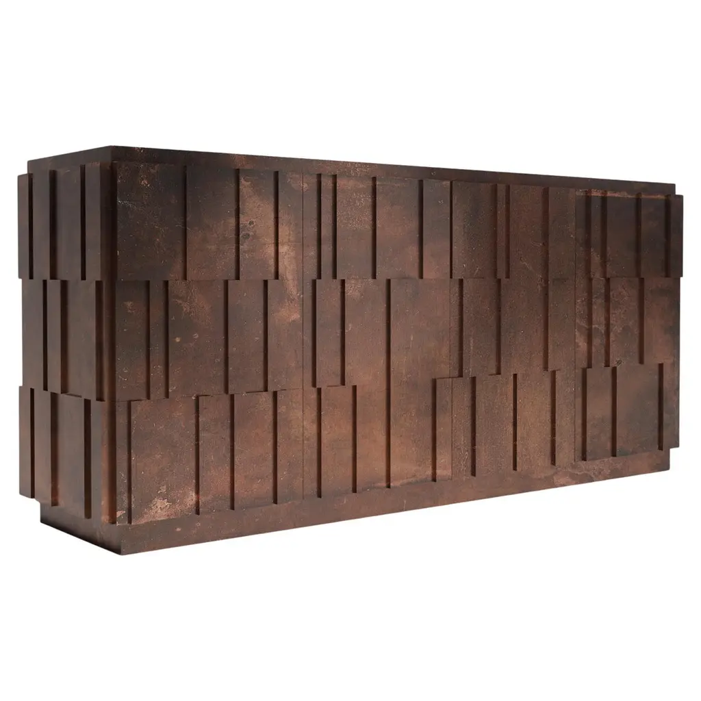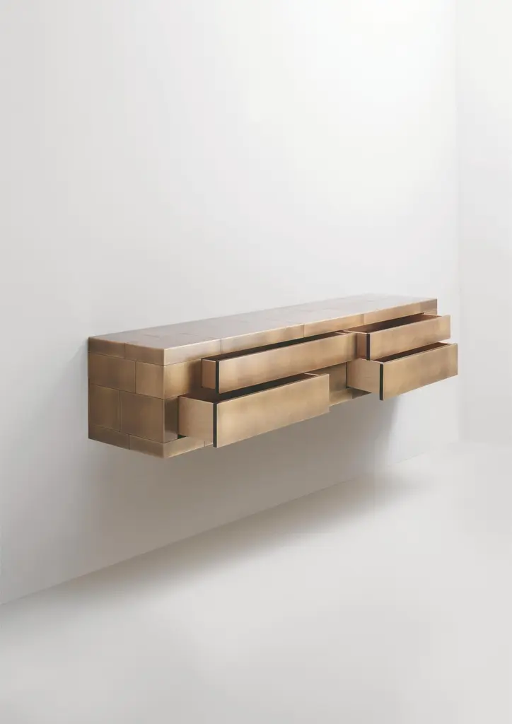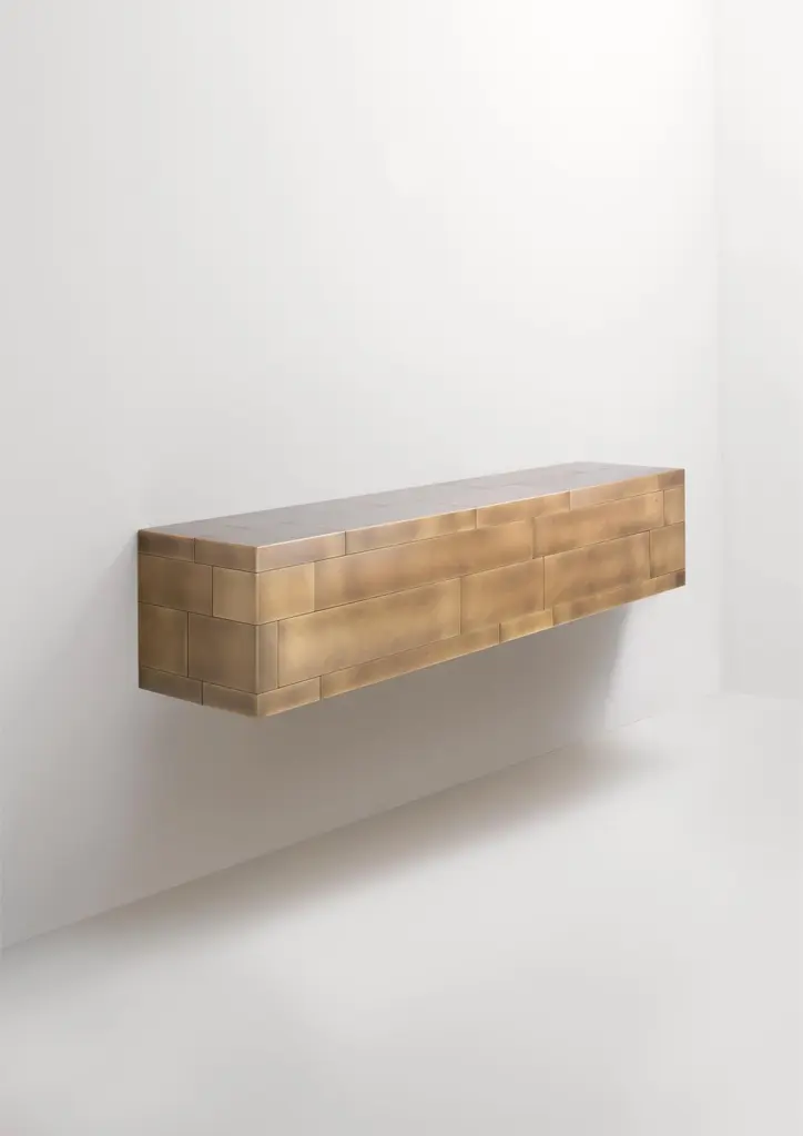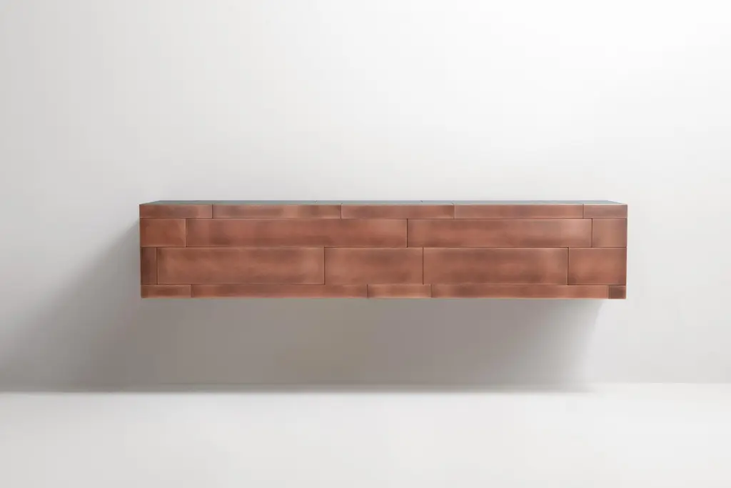Celato Wall Mounted Console by De CastelliDimensions: W 220 x D 45 x H 43 cmMaterials: Striped DeLabré Copper, Natural Oak WoodBrass and Stainless Steel versions are also available. Please contact us for any request.Celato is a reference to what is concealed to keep a memory intact; it’s an archetype in which beauty is revealed in stages. A monolithic appearance makes Celato a contemporary menhir; like a legend that tells of magnificent treasures safeguarded below sacred stones, Celato reveals its dual soul, with many internal, hidden, almost secret spaces. It combines several tesserae to form a whole: aesthetics, function and an incredible ability to make each piece unique, never identical to the next, which is revealed without impudence, walking an avant-garde line between tradition and modernity.DE CASTELLI“HARD COUTURE”Faithful to its decision to reinstate the special role of metal in design and experimentation, De Castelli infuses artisan ideas and workmanship into industrial processes, leading to entirely original results. The encounter with design inspires an approach to materials founded upon respect for their potential, be it hidden or obvious, which emerges slowly in a collection of pieces that, despite being part of a series, remain unique.Unique not only for the hand that has created them, but also for the singular cultural path that focuses on the aesthetic (and not just practical) value of the primordial material with which De Castelli shapes living spaces.A BESPOKE APPROACHEach object, even in the repetition of form, is a creative act in and of itself, one that incorporates a heritage of constantly-evolving expertise and research. The equation that relegates ‘cold’ metals to the margins of furnishing projects is thus overturned, bringing iron, brass and copper, in their infinite variations and finishes, to the centre of an entirely renewed stage, allowing them to finally shine with their own light.SUSTAINABILITYDe Castelli has always been committed to making the entire production cycle increasingly sustainable, aware that metal, the material with which its business identifies itself, is precious and must be treated with care, without waste.PEOPLE FIRSTThe wide spaces of the De Castelli headquarters in Crocetta del Montello (TV) allow those who work to enjoy environments where order, cleanliness and safety are always maintained and guaranteed. An attitude of attention and respect for people that has led to the shared ethical code.