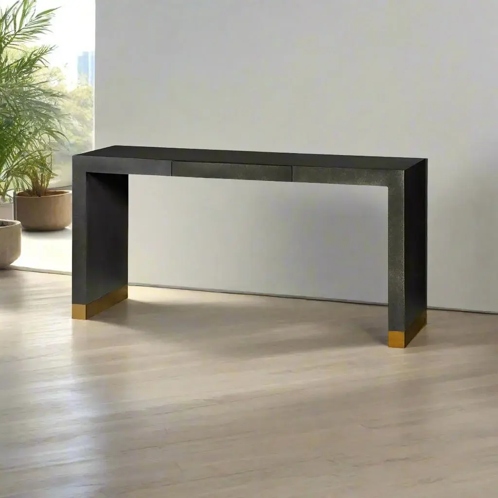 This table showcases a smooth, waterfall-style top that seamlessly flows into the ends. A centered storage drawer is integrated into the apron, offering both style and convenience. The console table features a hand-painted Charcoal finish, adding a touch of sophistication to any space. The block-style legs are accented with brass ferrules, providing a subtle yet striking contrast. Ideal for your home's entry or living space, this table is designed to elevate your home with its timeless charm and practical storage solutions. Dimensions: 62" W x 20" D x 30.5" H