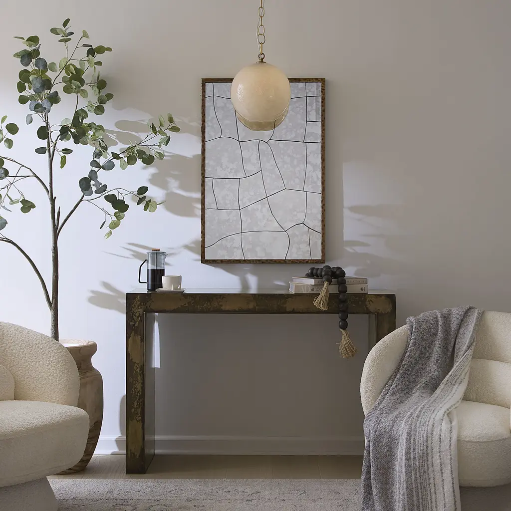 A rich metallic console with a simple linear design adds subtle glamour wherever it is placed. The Charlemagne Console Table is made from lightweight iron and features a swirling mineral patina that enhances its earthy alloy tones. The smooth surfaces reflect a subtle iridescence to elevate any room.