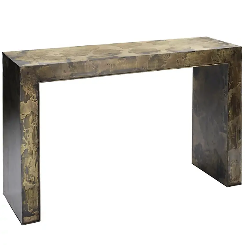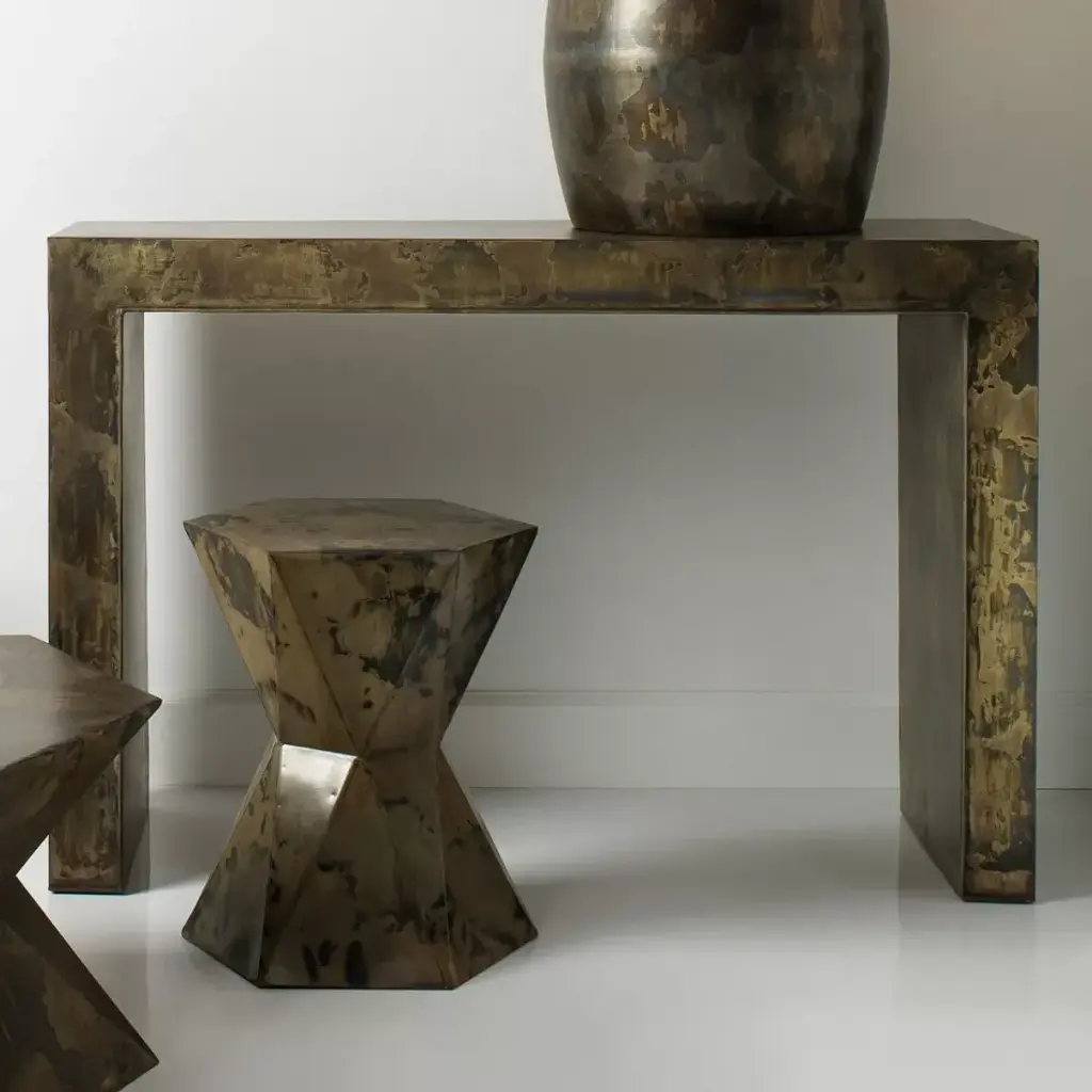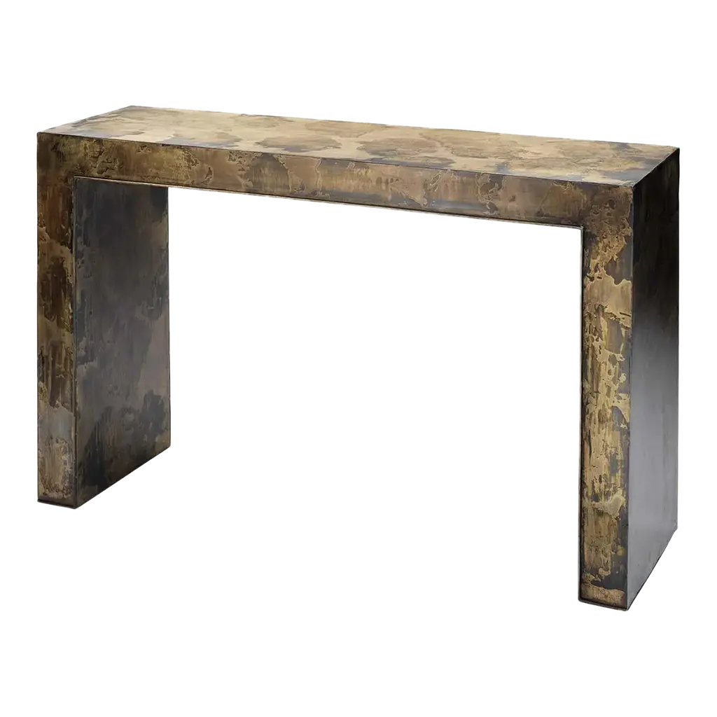 A rich metallic console with a simple linear design adds subtle glamour wherever it is placed. The Charlemagne Console Table is made from lightweight iron and features a swirling mineral patina that enhances its earthy alloy tones. The smooth surfaces reflect a subtle iridescence to elevate any room.