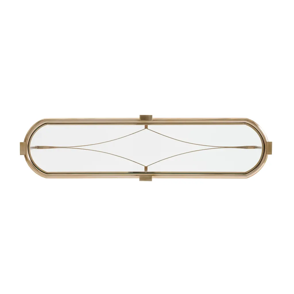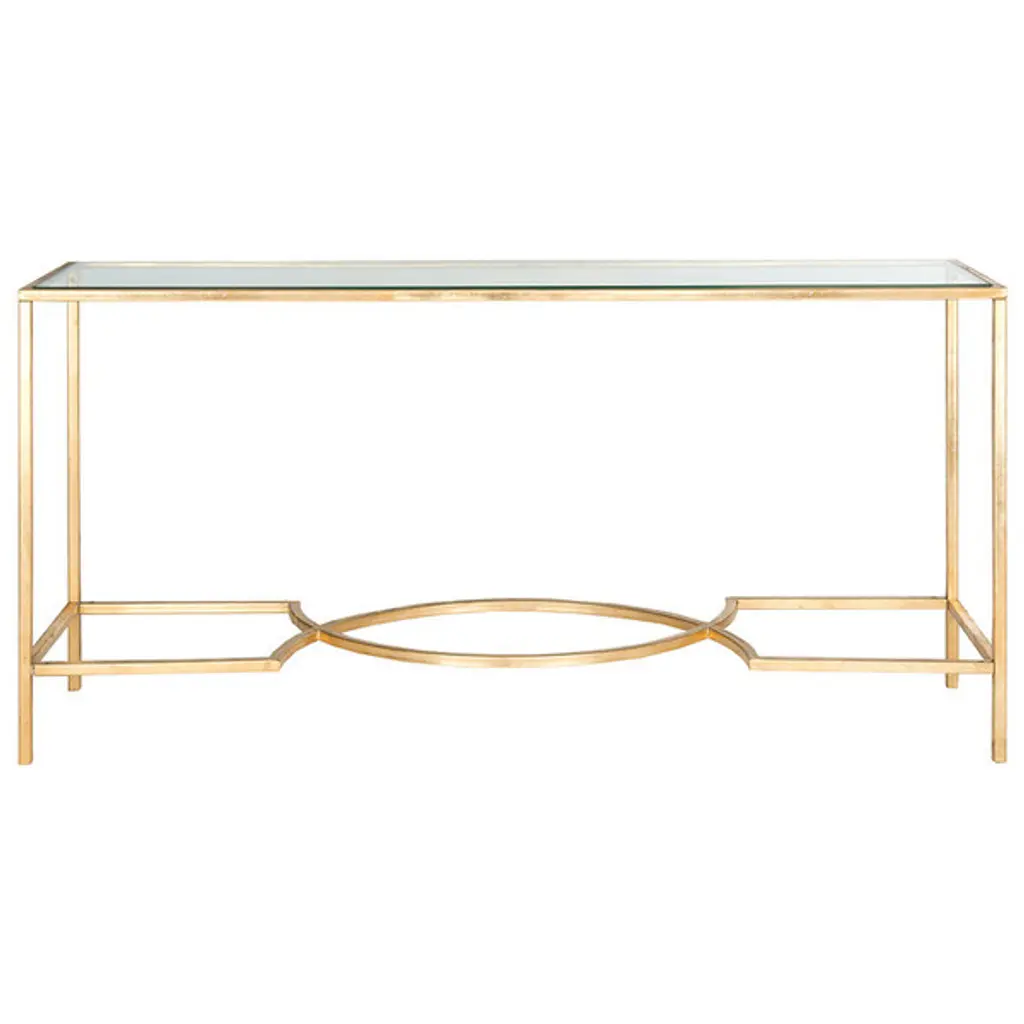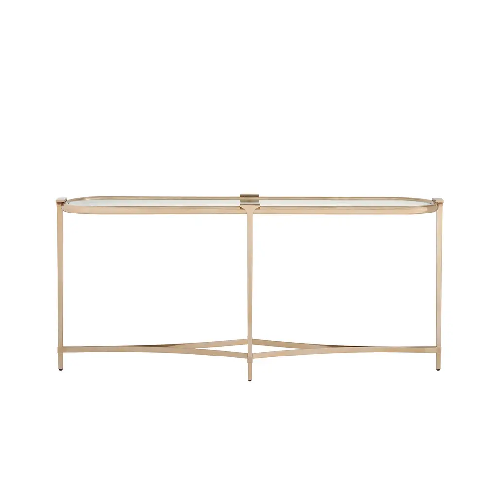Ideal for foyers, long hallways, and along the back of sofas, the Chelsea Console Table is a beautiful spot to display favorite keepsakes or keep essentials close at hand. The brass frame adds warmth to any space, while it's overall petite design and complimenting glass top make it an airy addition to your home. Ships In 4-5 Weeks Glass top Brass finish frame This image is for illustrative purposes only. The colors shown are accurate within the constraints of lighting, photography, and the color accuracy of your screen.
