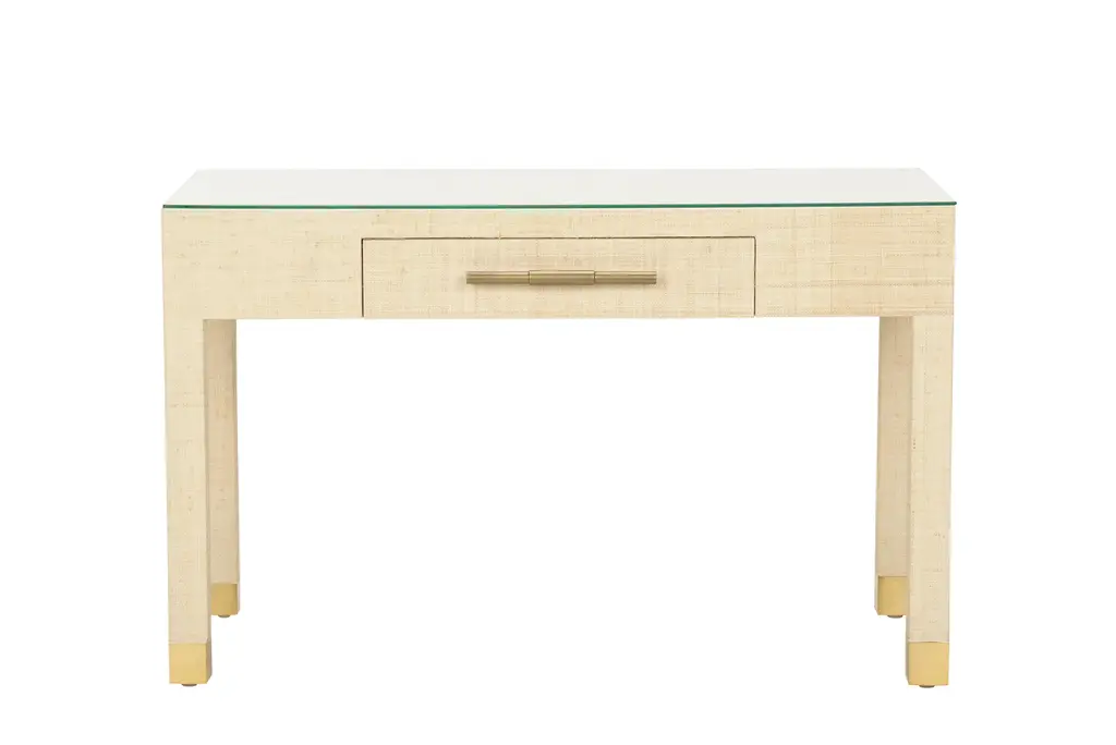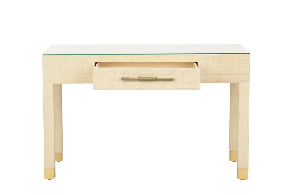 Sophisticated Yet Functional, The Sophisticate Console Table From The Cheryl Luckett Collection For Wildwood Is Wrapped In Natural Saguran Adding Warmth And Texture To Any Space. Organize And Store Papers Or Trinkets In The Drawer That Features An Antique Brass Handle And Soft Closing, Full Extension Drawer Slides. The Tempered Glass Tabletop Provides Optimal Space For Displaying A Lamp And Your Favorite Decorative Accents. Natural Variations In The Sagural May Occur But Create A Uniqueness To Each Piece.