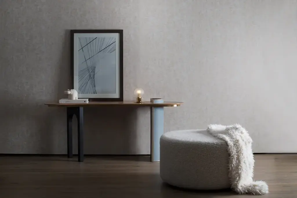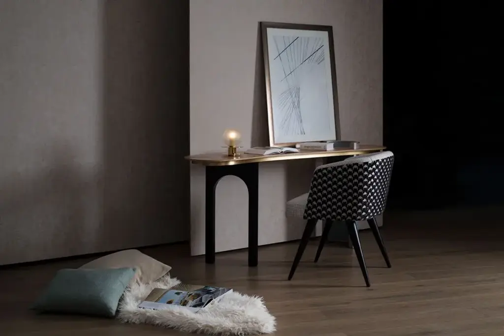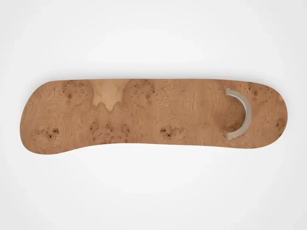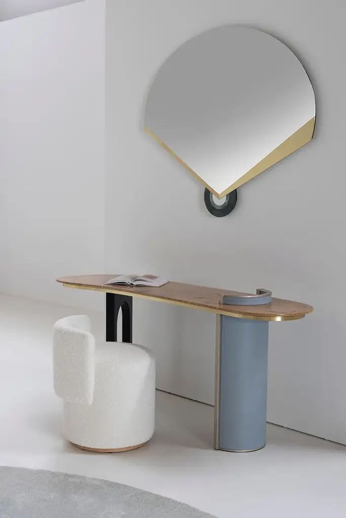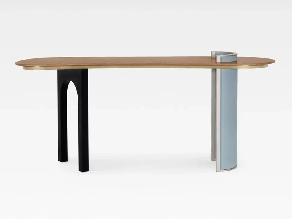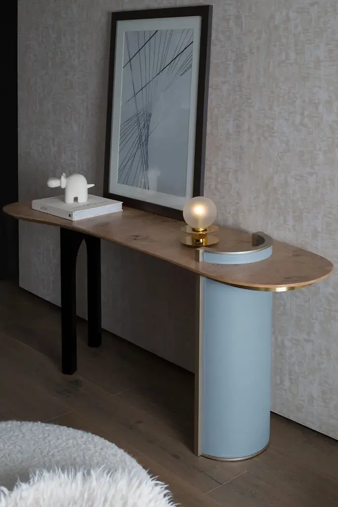 Inspired by Lisbon's historic quarter, this beautiful piece exceeds all expectations. With its striking lines, elegant silhouettes, and premium composition, CHIADO console table is a tribute to artistic life, bohemian nights, and the Lisbon way of life. A sophisticated statement piece that can be combined with a variety of interior styles. It seduces with its wooden base upholstered in light blue Italian leather and its beautiful Oak Root veneer top.With its eye-catching brushed brass and golden bronze details, CHIADO celebrates a unique, natural wood grain that will undoubtedly accentuate any décor with its natural, artistic expression.Materials & FinishesWD106 Oak root; natural colour; satin finishME006 Brushed brass; high-gloss finishFI007 Black lacquer; satin finishFI073 Champagne bronze powder; high-gloss finishM103887 Light Blue high standard Italian leather