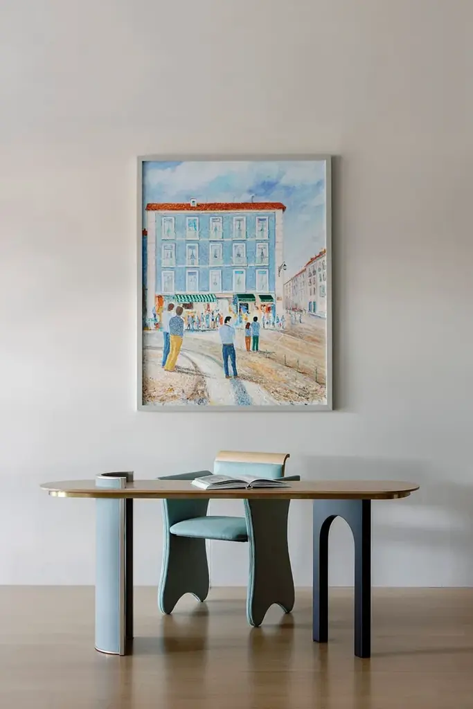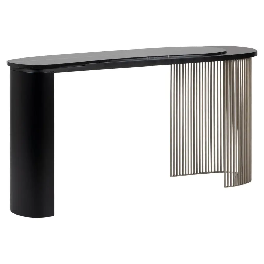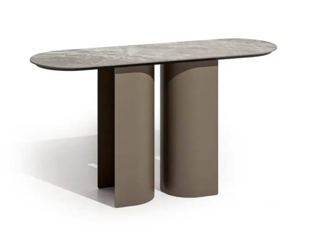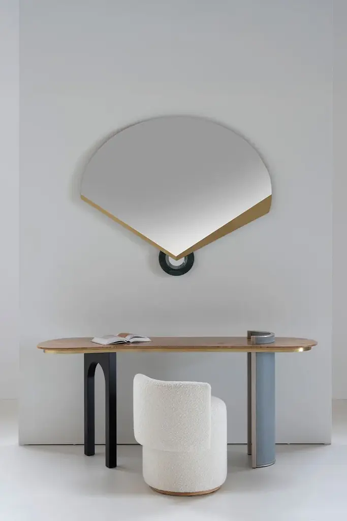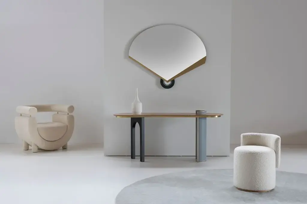 Inspired by Lisbon's historic quarter, this beautiful piece exceeds all expectations. With its striking lines, elegant silhouettes, and premium composition, CHIADO console table is a tribute to artistic life, bohemian nights, and the Lisbon way of life. A sophisticated statement piece that can be combined with a variety of interior styles. It seduces with its wooden base upholstered in light blue Italian leather and its beautiful Oak Root veneer top.With its eye-catching brushed brass and golden bronze details, CHIADO celebrates a unique, natural wood grain that will undoubtedly accentuate any décor with its natural, artistic expression.Materials & FinishesWD106 Oak root; natural colour; satin finishME006 Brushed brass; high-gloss finishFI007 Black lacquer; satin finishFI073 Champagne bronze powder; high-gloss finishM103887 Light Blue high standard Italian leather