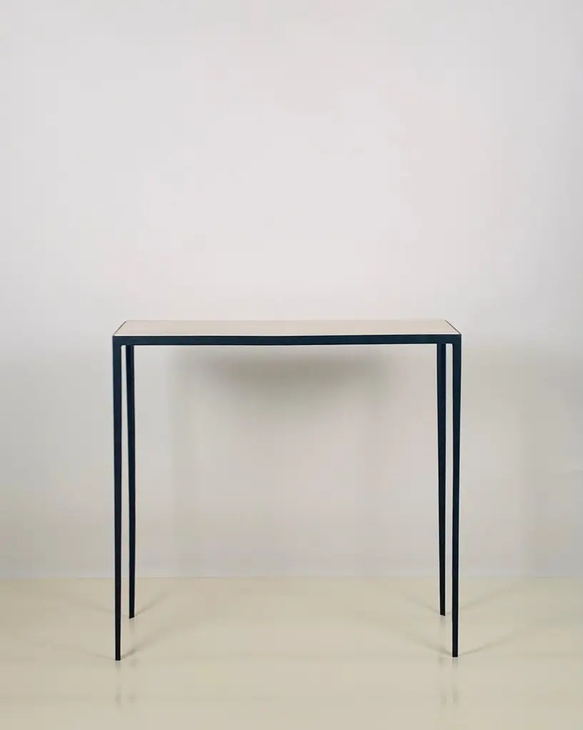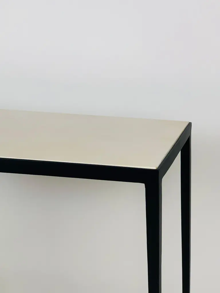 Contrasting grained cream parchment top over slender blackened steel base. Beautiful, simple, understated design.