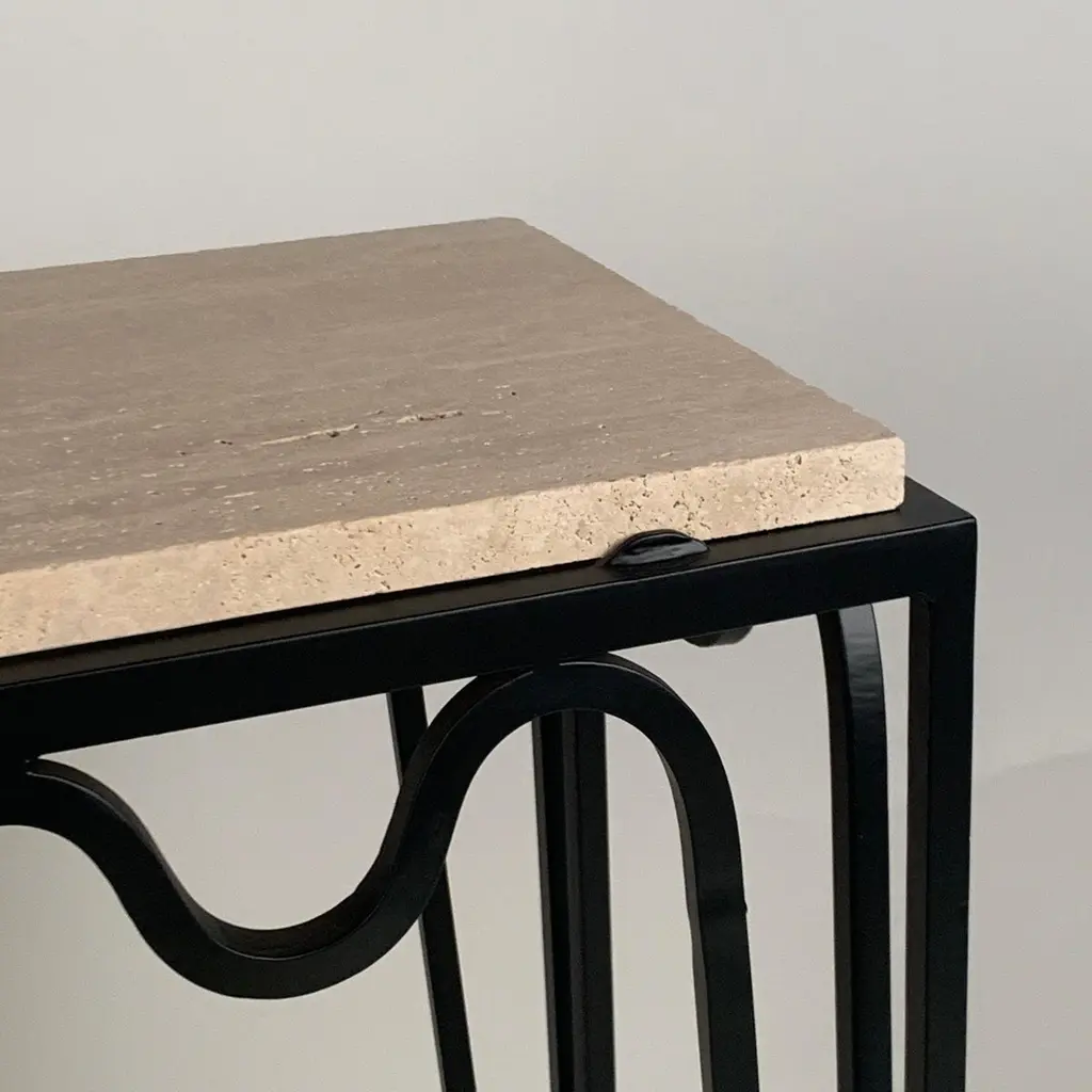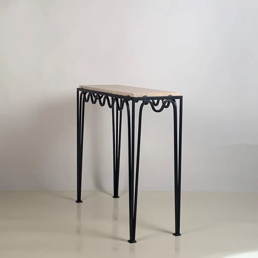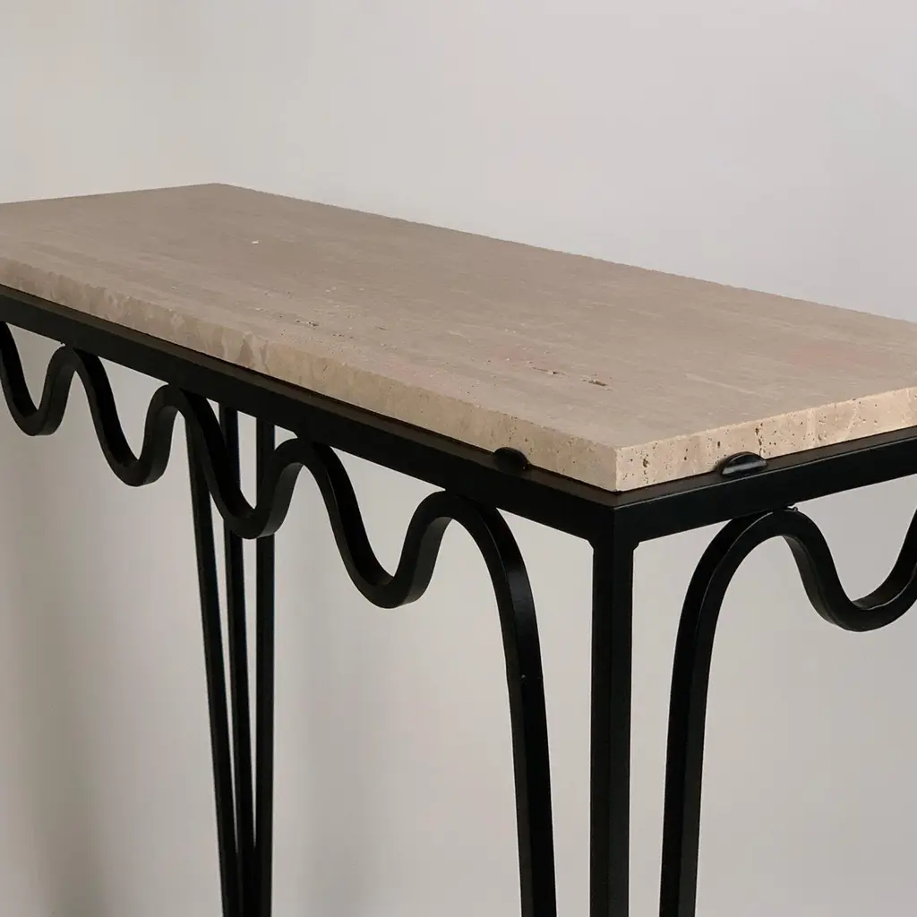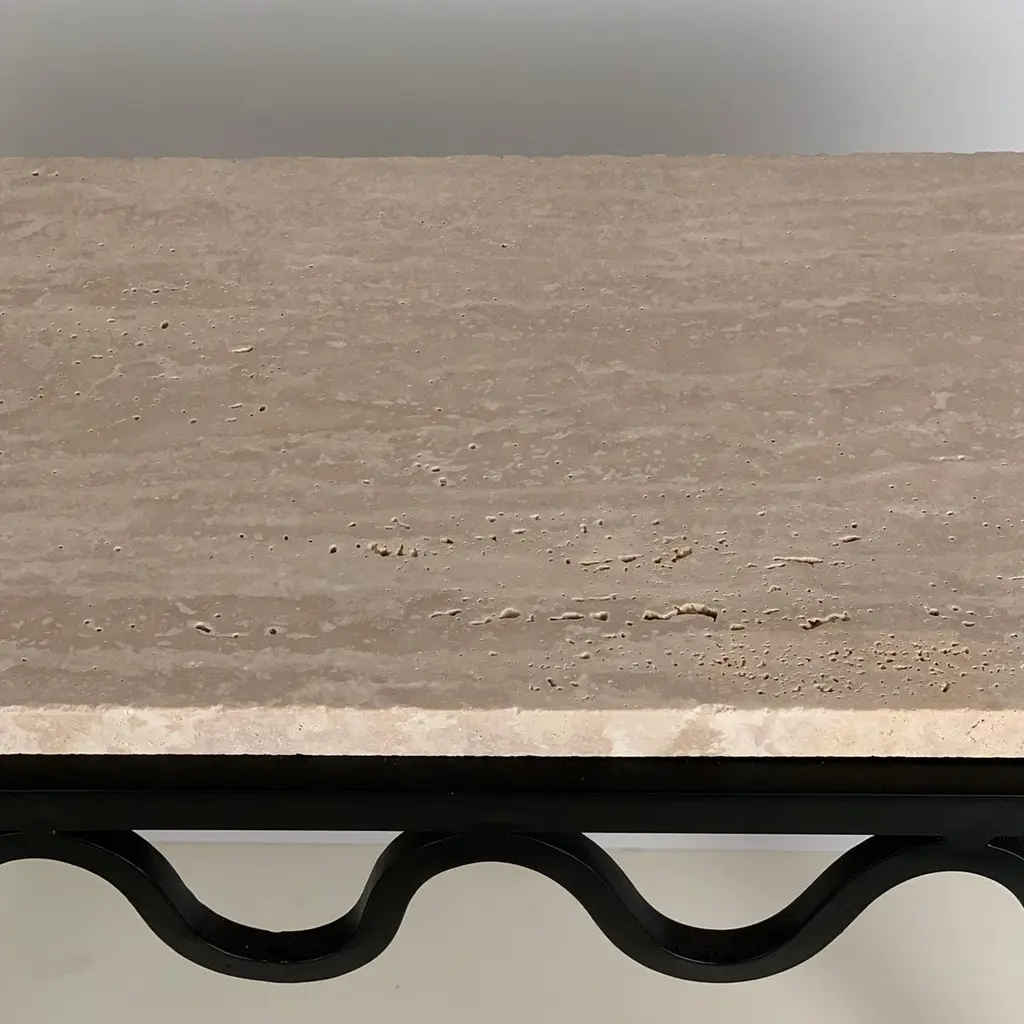 Chic 'Méandre' travertine console by Design Frères.Sturdy powder coated base fitted with a gorgeous unfilled Italian travertine top.Inspired by the timeless aesthetic of French modern design, this console from our exclusive Design Frères line is handmade in our Los Angeles atelier by our skilled artisans. This classic piece will blend in, structure and enhance any space.