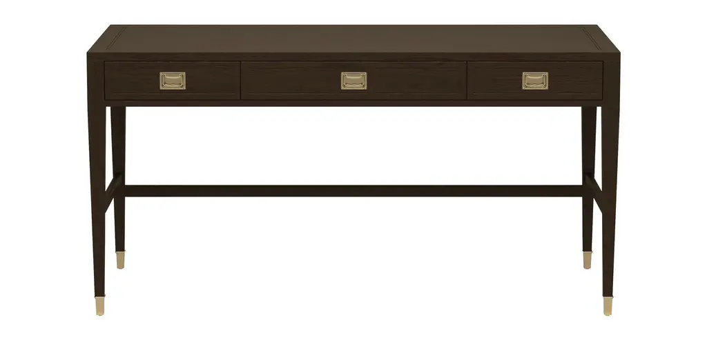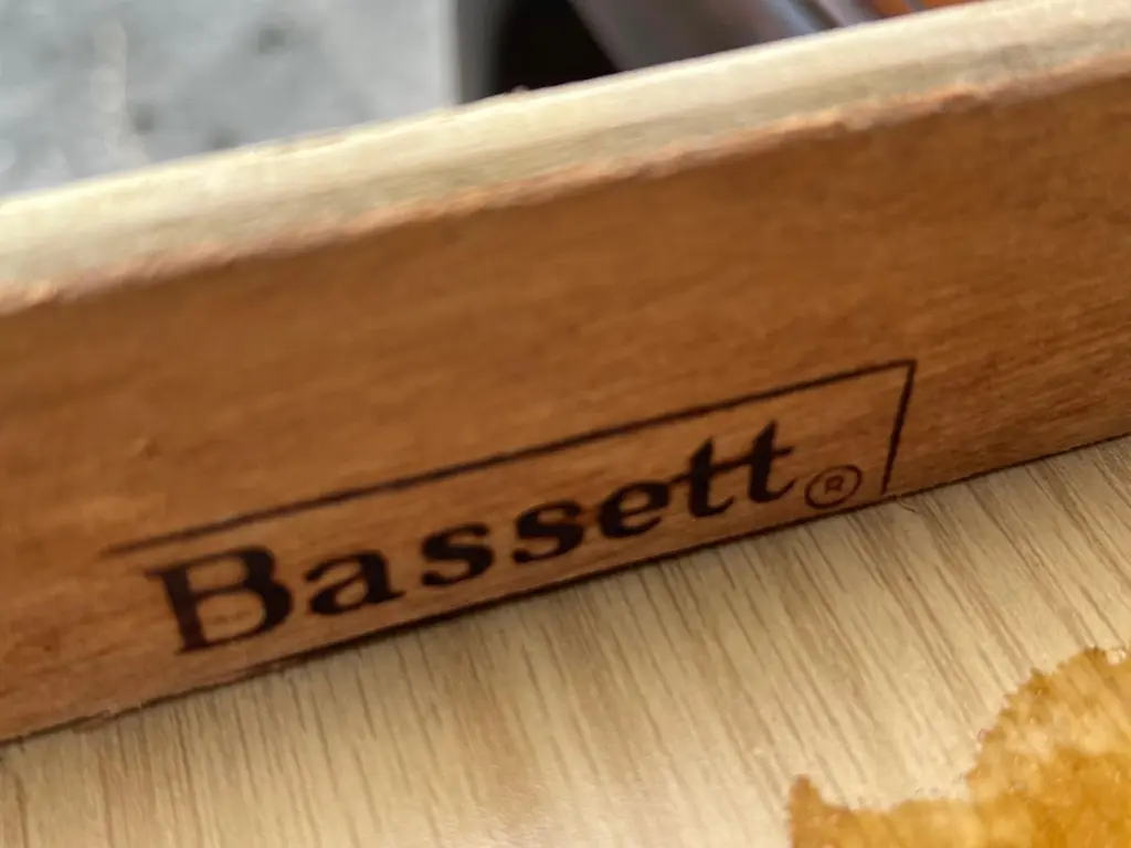 A classic Chinoiserie style console table by Bassett, made in the USA ca' 1970's. Distinctive flared legs, etched glass/inset top with decorative motifs, center pull out drawer. Finished on the back-a nice detail.