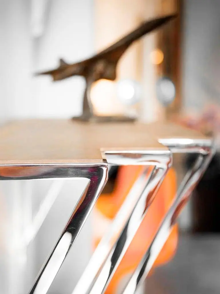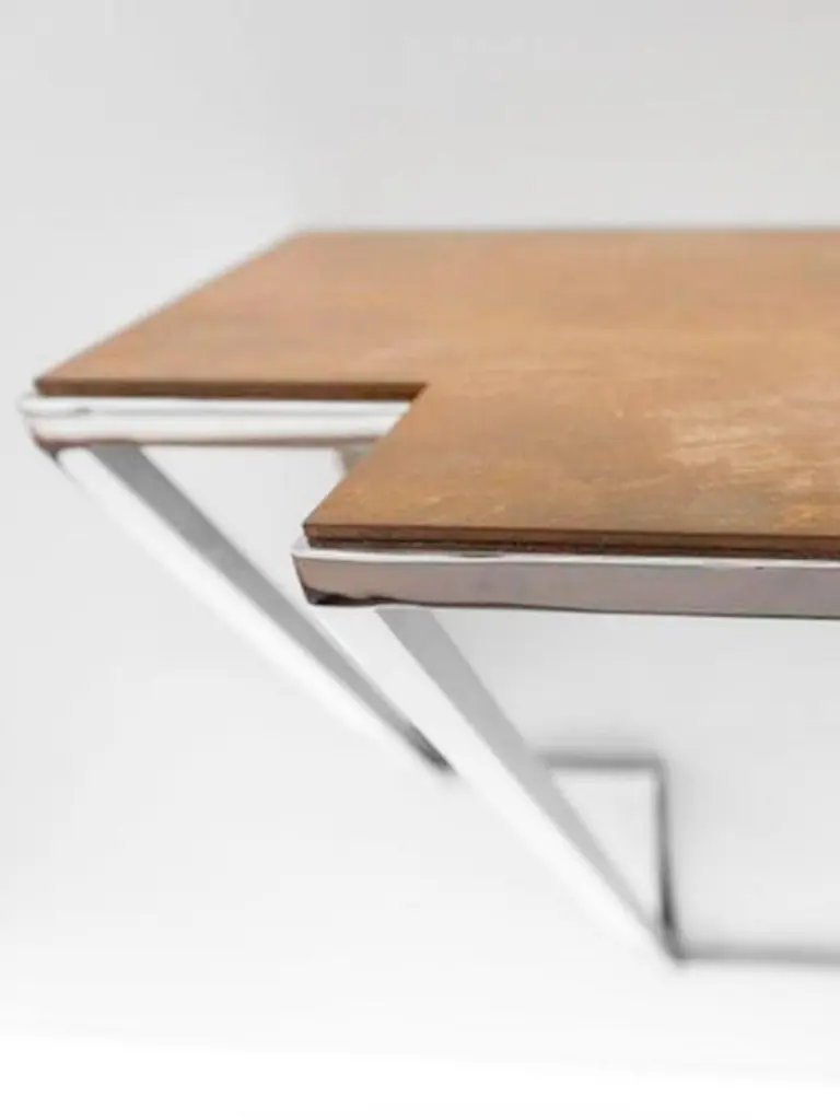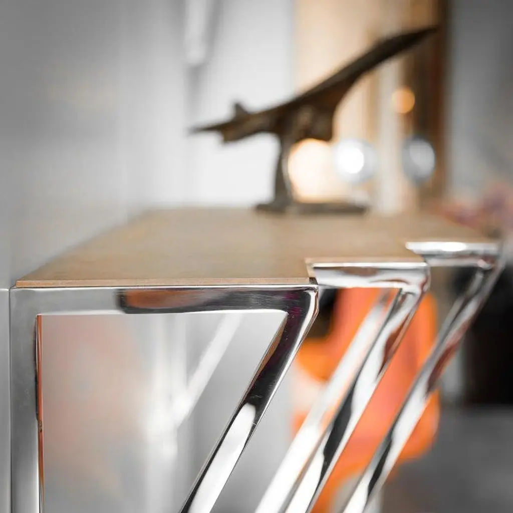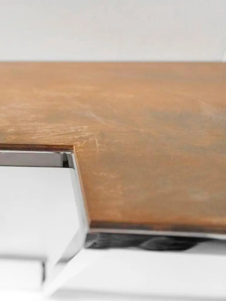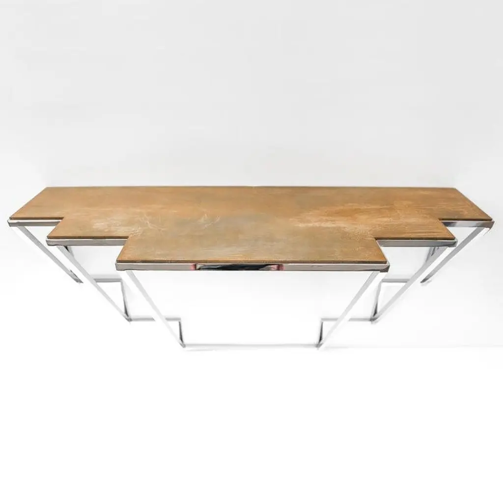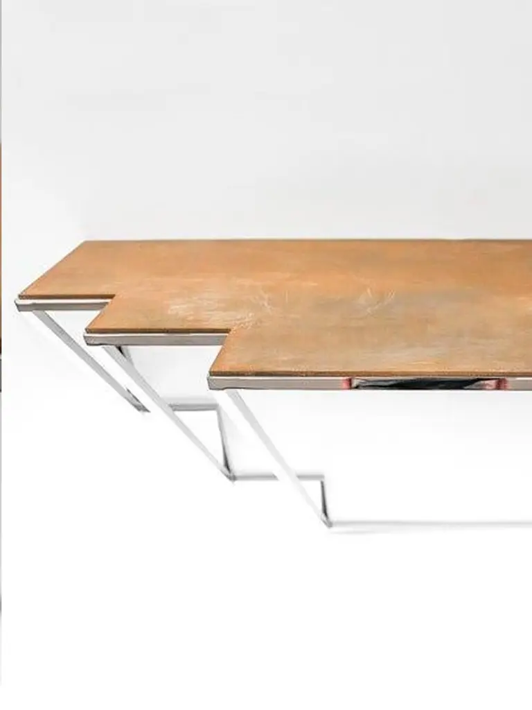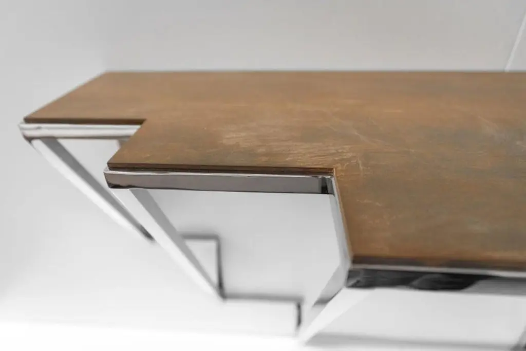 An architectural wall-mounted console inspired by 1930s skyscrapers.Top in hand oxidized steelBase in polished stainless steel. DimensionsWidth: 130 cm / 51.18 inchesDepth: 42 cm / 16.54 inchesHeight: 75 cm / 29.53 inches