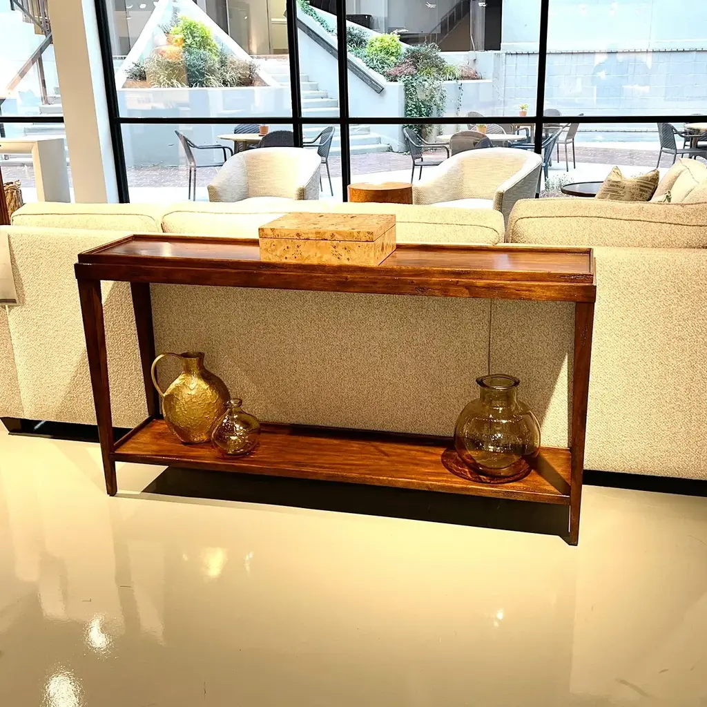 A Classic console table with a warm finish with subtle distressing and hand-rubbed finish, with a wooden galleried dish top, square tapered legs and a shelf stretcher. Dimension: 62" W x 13.75" D x 33" H