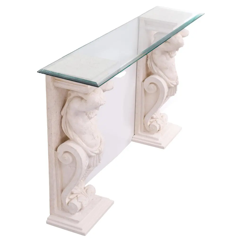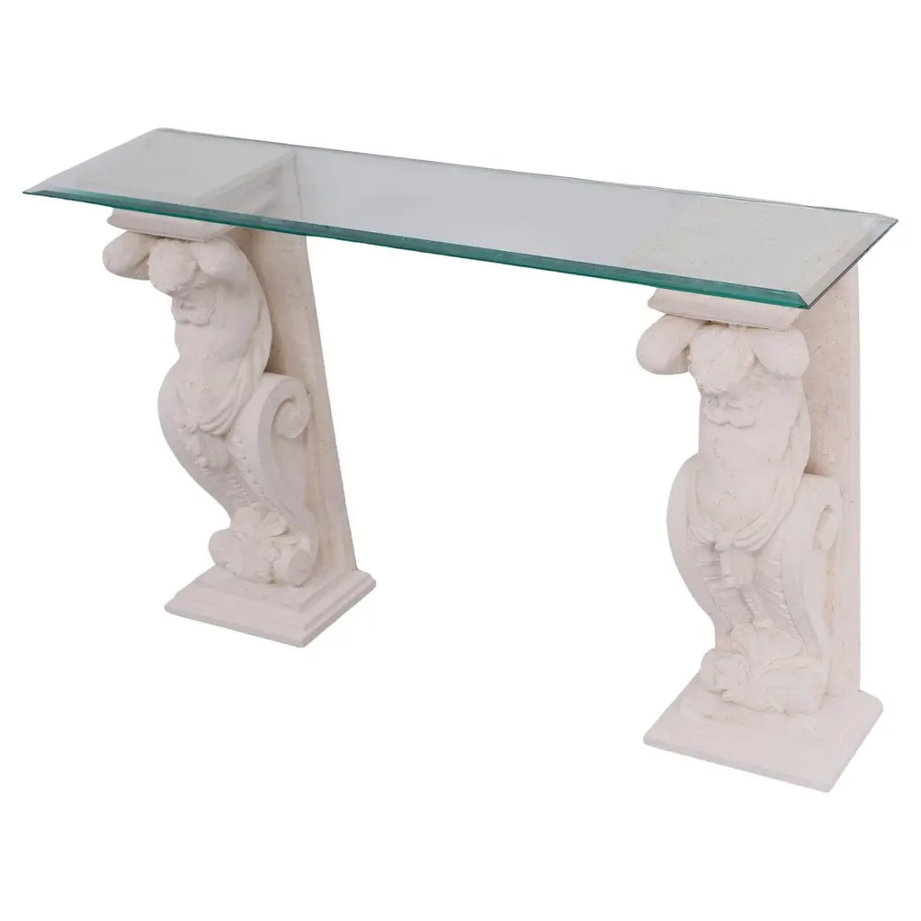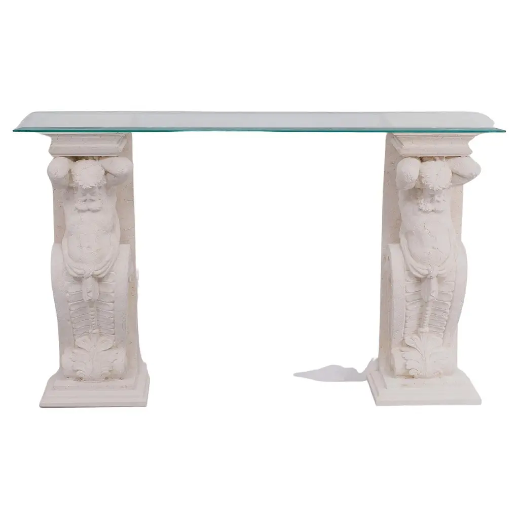 Two unique Cast Stone console tables, mythologies Greek manly figures carry en,a beveled Glass top, so very decorative.