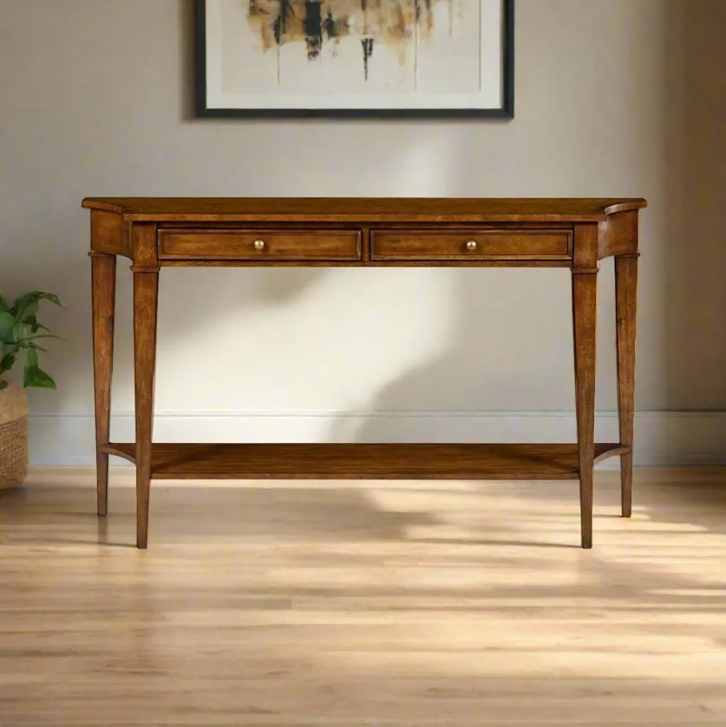 A Classic Rustic warm stained console table with a shaped top with incurved ends, on square tapered legs with a long frieze drawer and shelf stretcher base.Dimensions: 60" W x 14" D x 34" H
